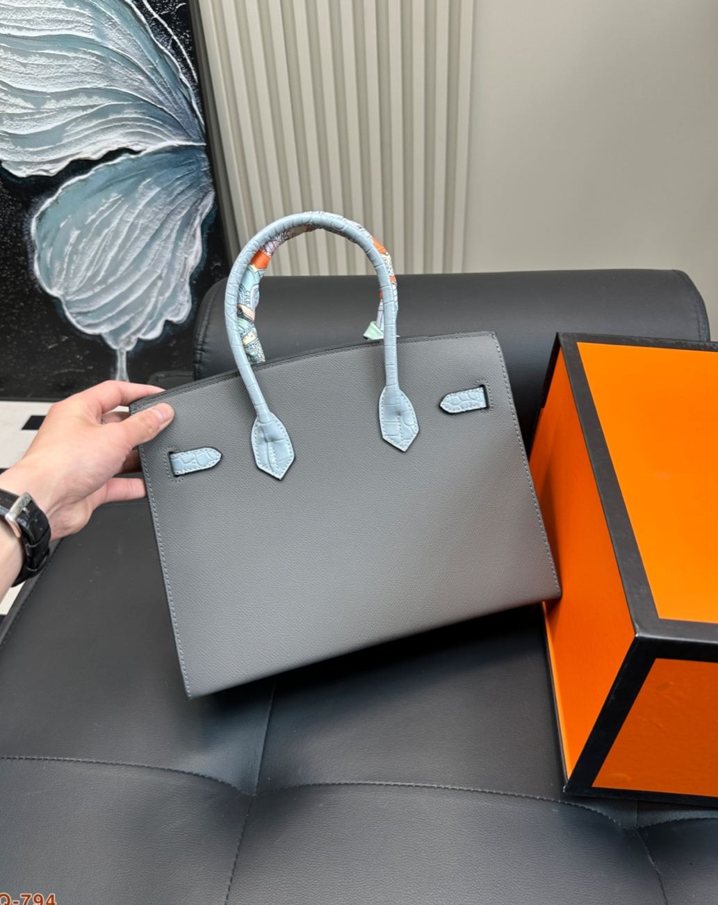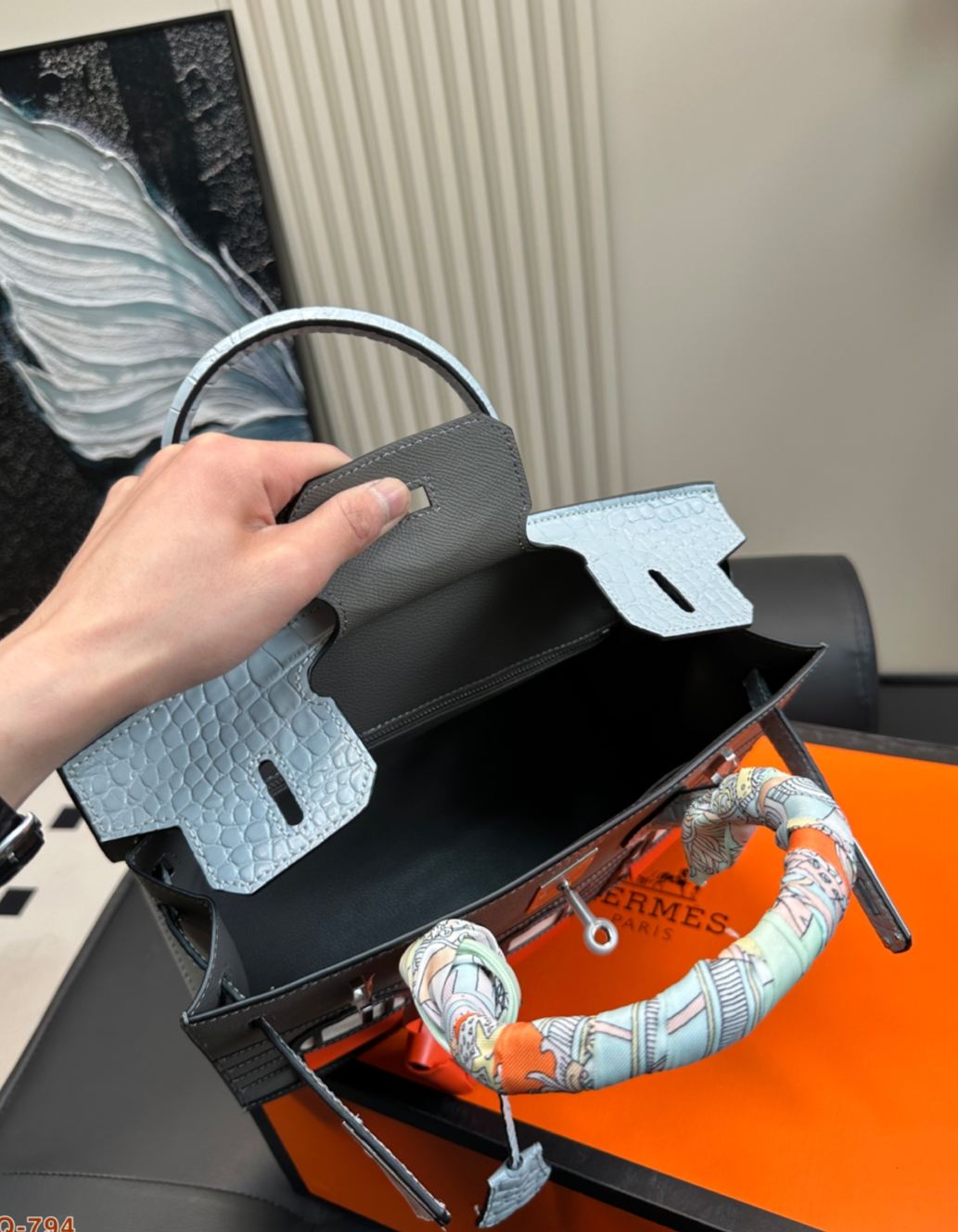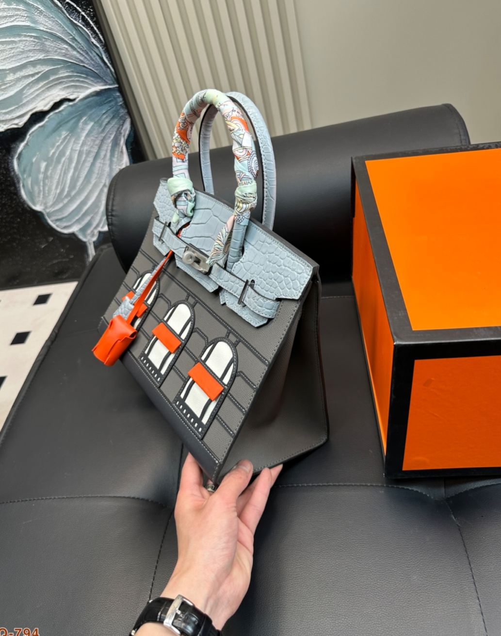 2019年に発表された限定モデルで、パリ・フォーブール通り24号店の外観をモチーフにした「家型」デザインが特徴。トップに短吻ワニ革、ボディにマダム牛革を使用し、窓部分にはエプソム革を採用した多素材組み合わせ。20cmのミニサイズながら外縫い製法で立体感を強調し、シルバー金具とオレンジのアクセントがブランドのアイコン性を表現。4色展開されるカラーテーマ(昼/夜/深夜/初雪)ごとに異なる素材コンビネーションを採用