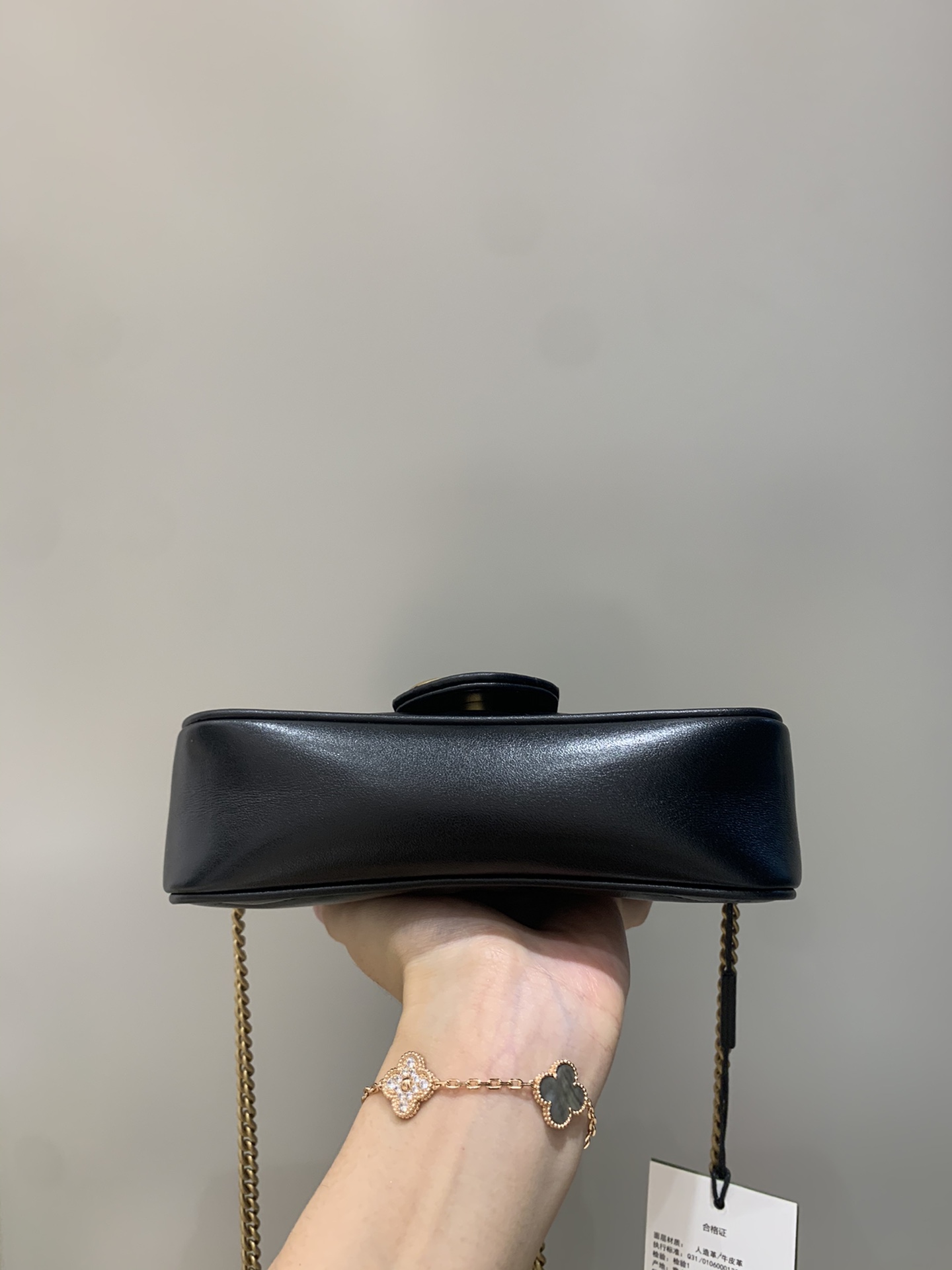 16.5cmのコンパクトサイズながら、ブラックレザーの上質な質感とゴールドのGGハードウェアが洗練された雰囲気を演出。ブラックレザーとゴールドのコントラストがブランドのエッセンスを体現しています。マチの広がりで実用的な収納力を持ち、スマートフォンや小物をすっきり収納可能。カジュアルからエレガントまで、様々なスタイルにマッチする万能なデザインです。
