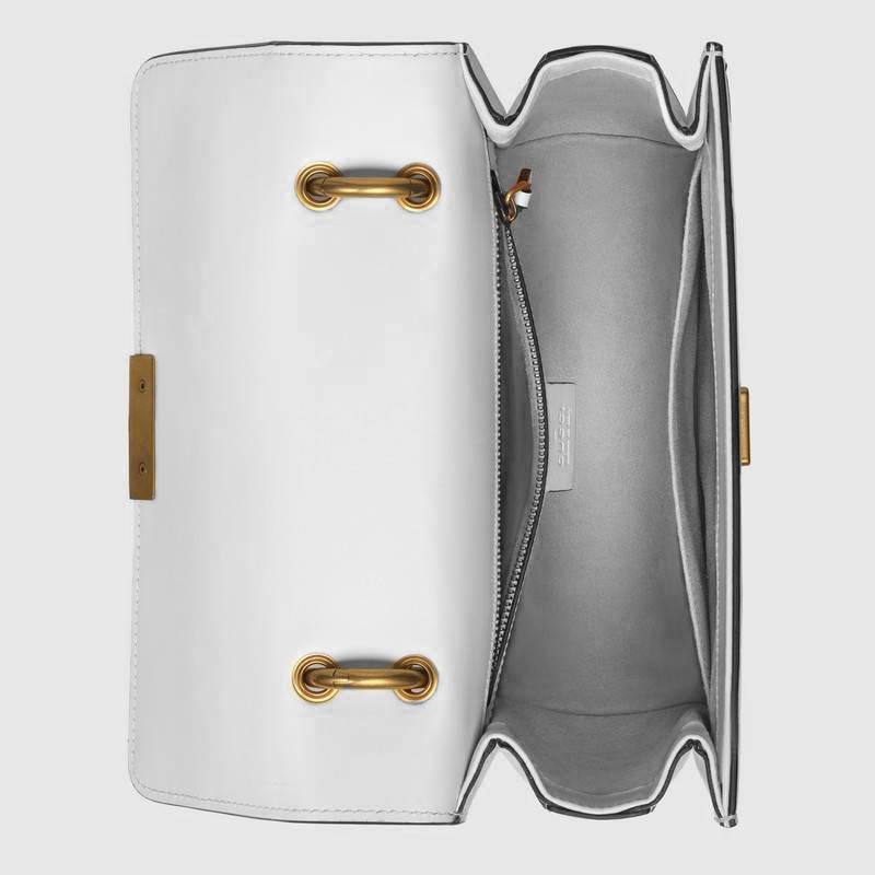 〔クイーンマーガレット〕ラインは,グッチのアイコニックなディテールと新たに考案されたデザインコードが融合しています。70年代に初めて采用されたアーカイブコードのひとつであるビー(ハチ)を,グラスパールとマルチカラークリスタルが引き立てます。トップハンドルからは,包括的なロマンティシズムを象徴する“盲爱”のゴールドエンボスがあしらわれたIDホルダーが吊り下げられています。上品な光沢感のあるスムースレザーを使用し,カラーブロックデザインに仕上げています。