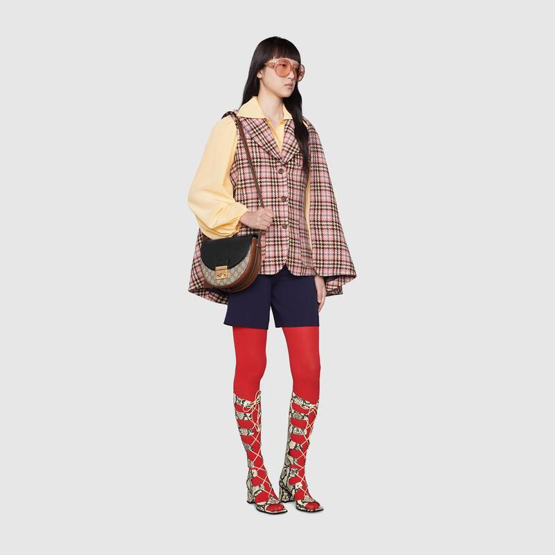 南京錠シリーズは、新しい三日月形のショルダーバッグを発売しました。 このショルダーバッグは、ブランドのクラシックなダブルG文字の織り交ぜパターンを備えたキャンバスでできており、独特の革のディテールとシリーズの象徴的なロック要素で装飾されています。