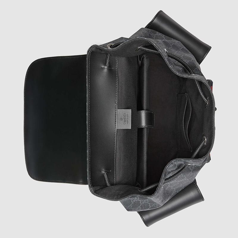 - マイクロファイバーファブリックにコーティングを施したブラック/グレー ソフト GGスプリームに、ブラック レザー トリム