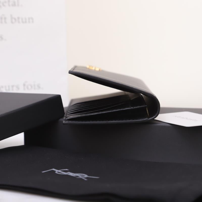 YSLのメンズ向けロングウォレットが新登場。11x18x2cmのスリムなボディに14のカードスロット、4つの紙幣ポケット、ファスナー付き小銭入れを完備。イタリア産スムースカーフの上質な風合いとマットブラックのメタルアクセントが、洗練されたビジネススタイルを演出。スーツの内ポケットにもすっきり収まる薄型デザインで、実用性とスタイルを両立した逸品です。