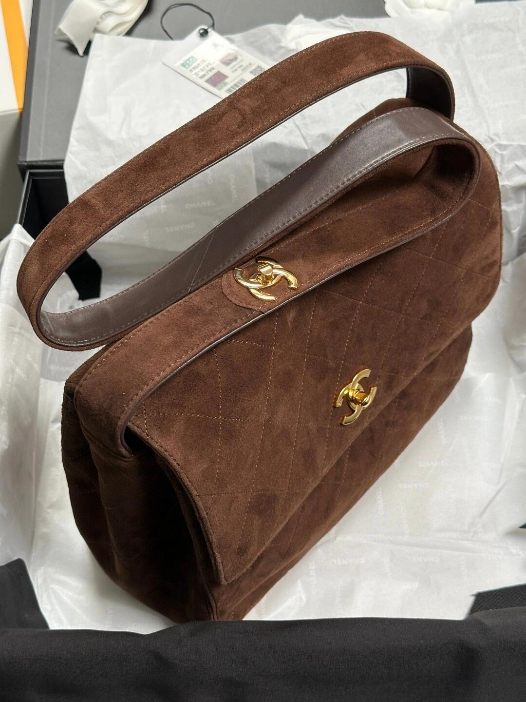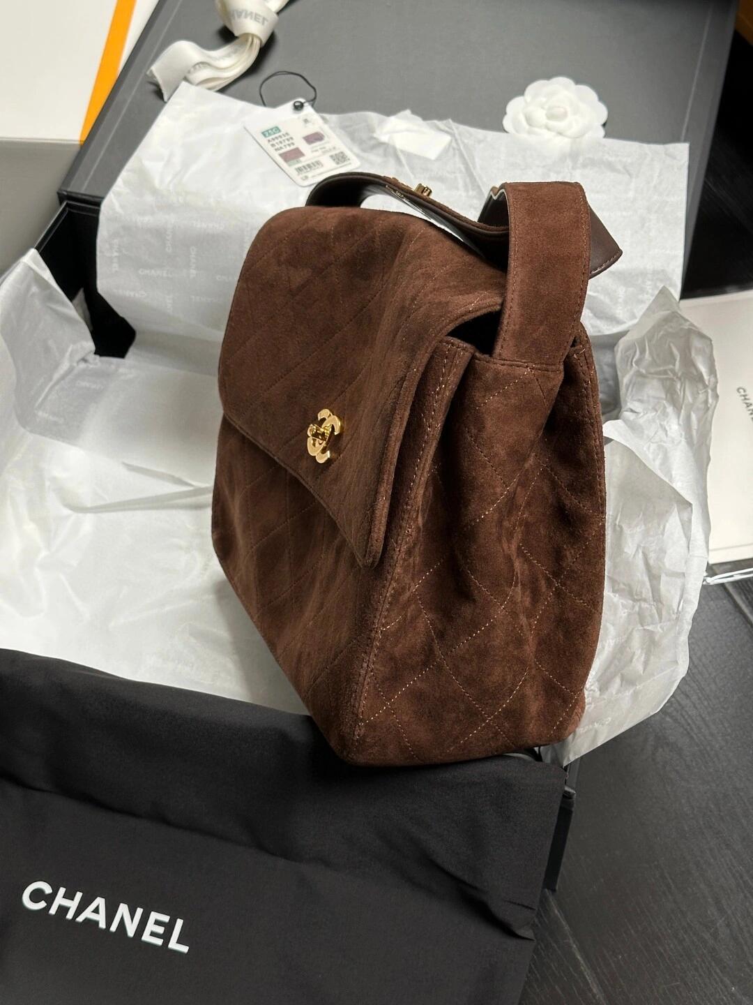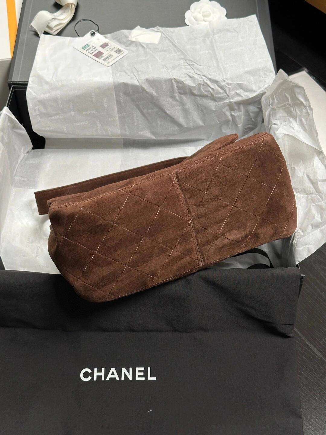 シャネルが提案する秋冬シーズンにぴったりのスエード&レザーコンビネーションバッグ。28×12.5x24cmの大容量ボディに、ヴィンテージ感あふれるココアブラウンの深みのあるカラーリング。表面は牛革の風合いながら、触り心地は厚手スエードの特徴的な質感。調節可能なチェーンストラップで、ショルダーやクロスボディなど多彩なスタイリングが可能です。