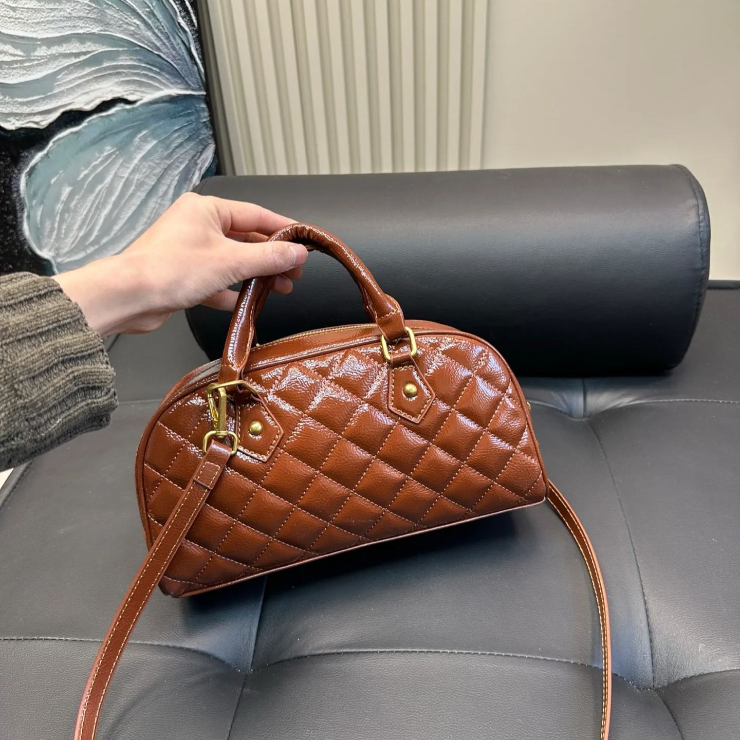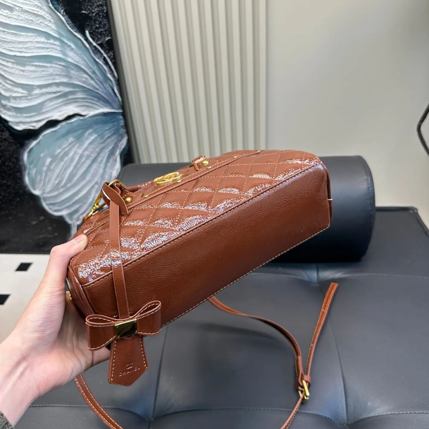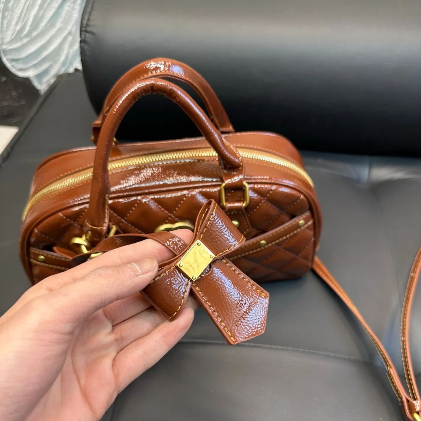 CHANELのボウリングバッグは、2025年春夏コレクションで発表された漆皮仕様のスポーティーなデザイン。34x24x15cmの大容量サイズで、Y2Kスタイルを意識した黒xシルバーのカラーコントラストが特徴。表面は指紋が付きにくい特殊加工のラミネートレザーを使用し、実用的かつモダンな印象。内側には複数のポケットを配置し、旅行や日常使いに最適。三角形の立体構造がユニークなシルエットを創出。
