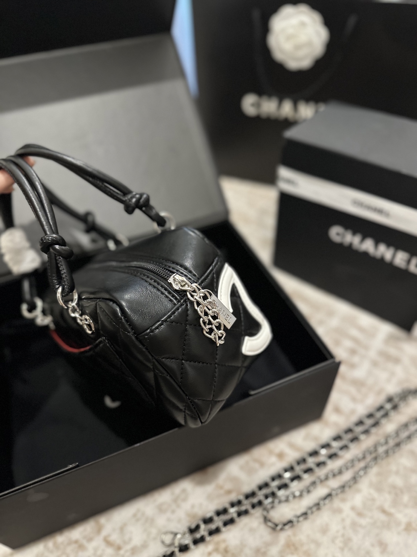 ダイヤモンドキルトと「CC」ロゴが特徴的で、クラシックかつモダンなスタイル。ブランドの歴史とエレガンスを凝縮したデザインです。 -