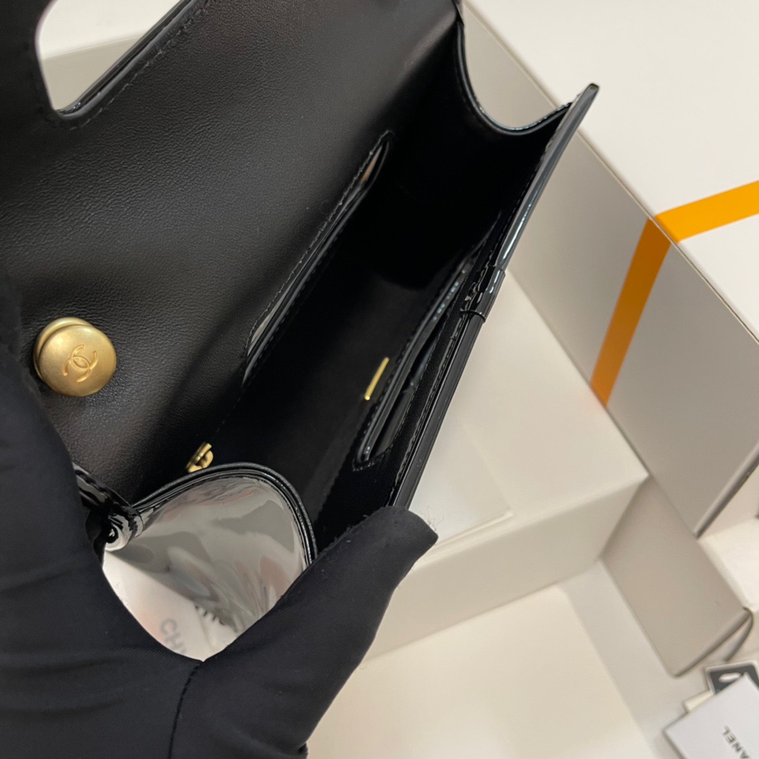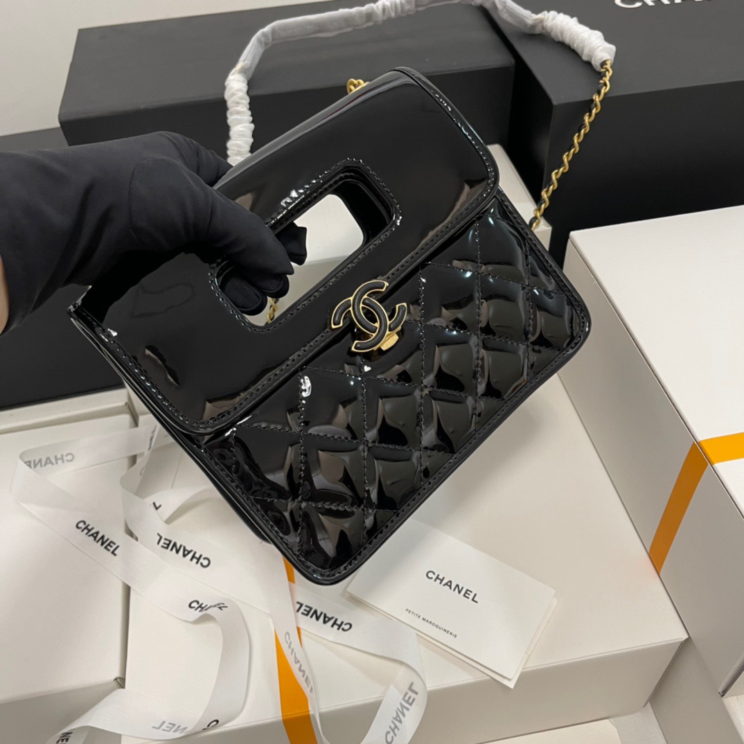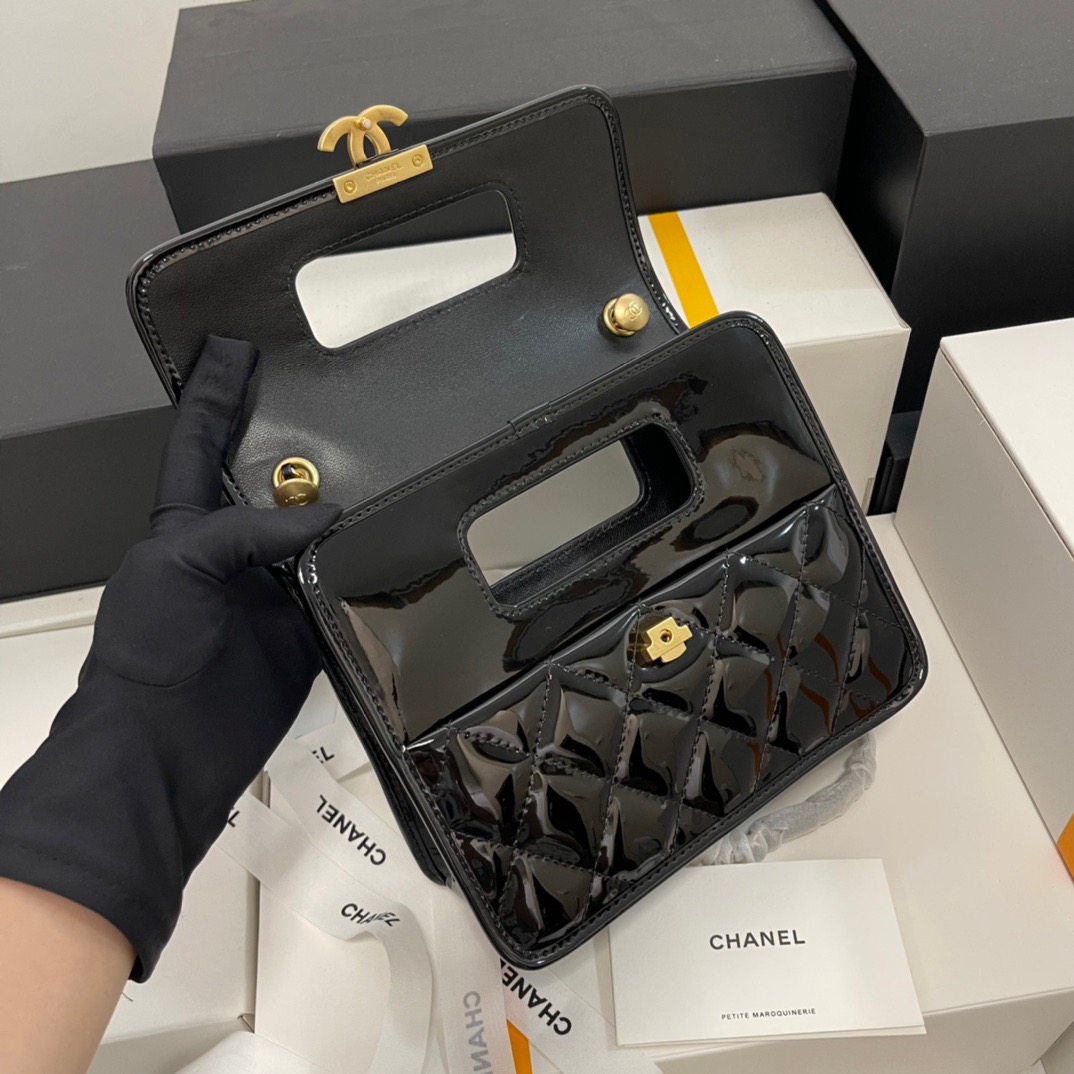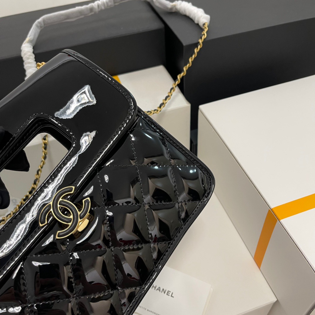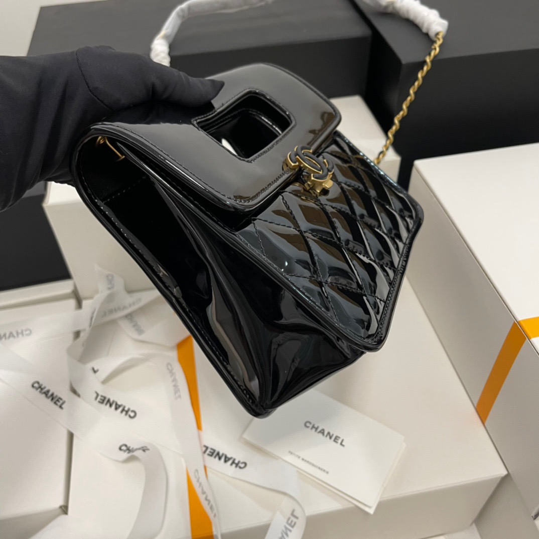 シャネル2023年春夏コレクションから登場した、艶やかなパテントレザーが特徴のフラップバッグ。18x20x8cmの使いやすいサイズで、日常使いに最適な収納力を持ちながら、洗練されたシルエットが魅力。ハンドヘルド、ショルダー、クロスボディと3WAYで使用可能。背面の便利なポケットも実用的です。