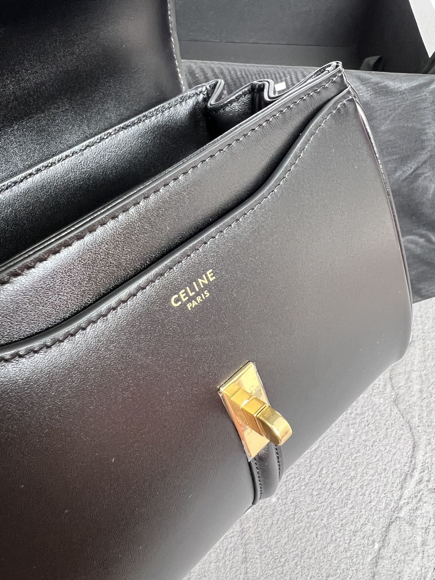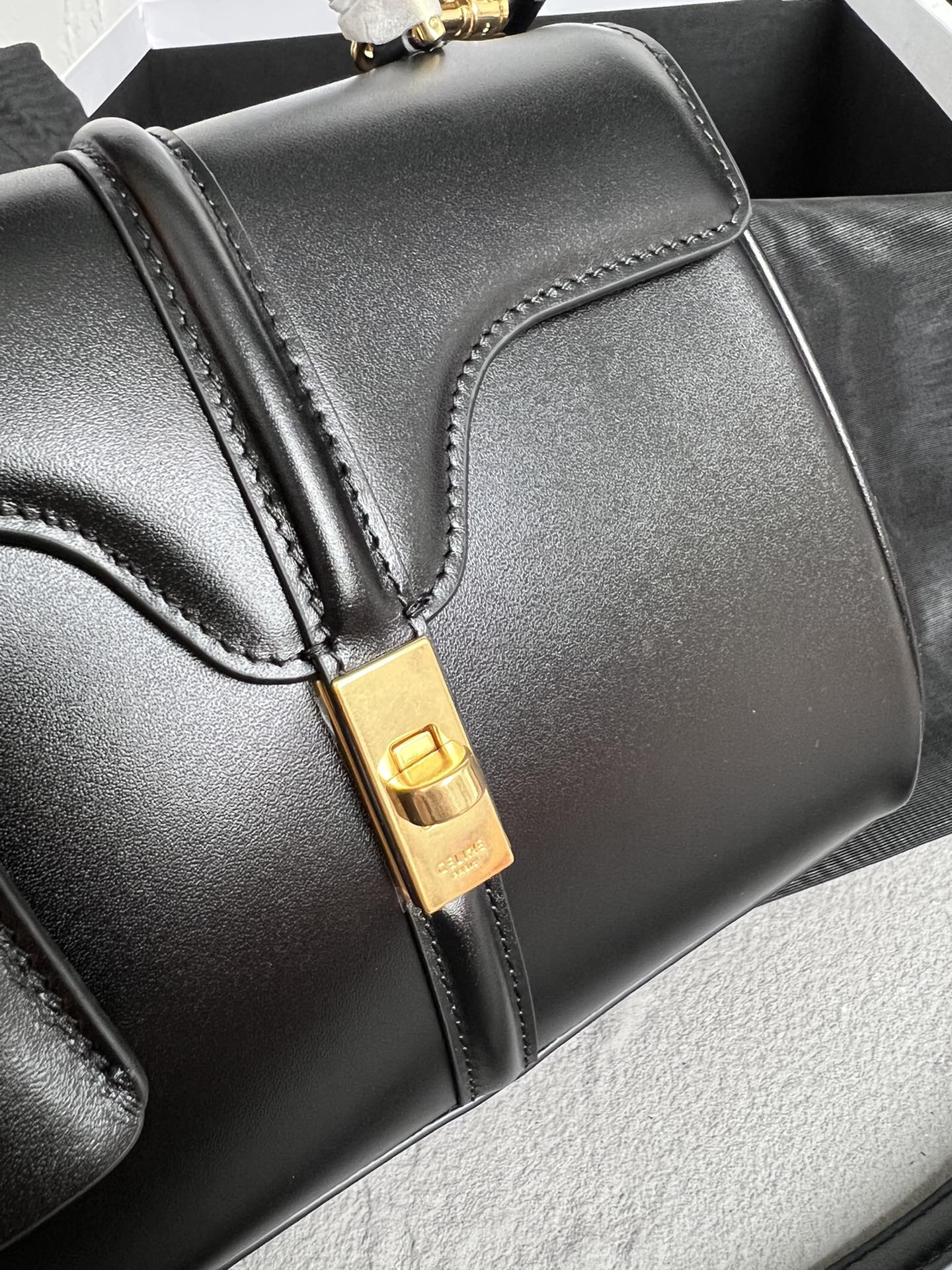 CELINEの「16」シリーズから生まれたコンパクトサイズのミニハンドバッグ。23x15x9cmの小型ボディながら、iPhone Pro Maxなどのスマートフォンも収納可能な実用性を備える。滑らかな牛皮革とシンプルなシルエットが洗練された大人のスタイルを演出。