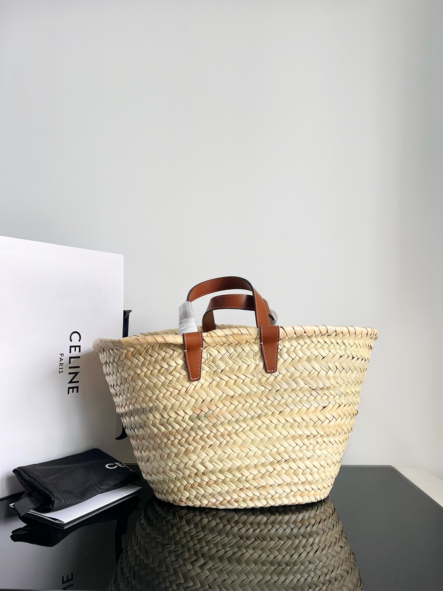37,800CELINEの2024年夏季限定「Plein Soleil」コレクションに登場した天然パームリーフ製のバスケットバッグ。31x20x12cmの大容量ボディで、ビーチアイテムや日常小物を収納可能。手編みのナチュラルな質感に、ブラックレザーのトリムとゴールドのトリオンフモチーフが洗練さを加えています47。付属のレザーショルダーストラップで、手提げや斜め掛けの2WAYスタイルに対応。