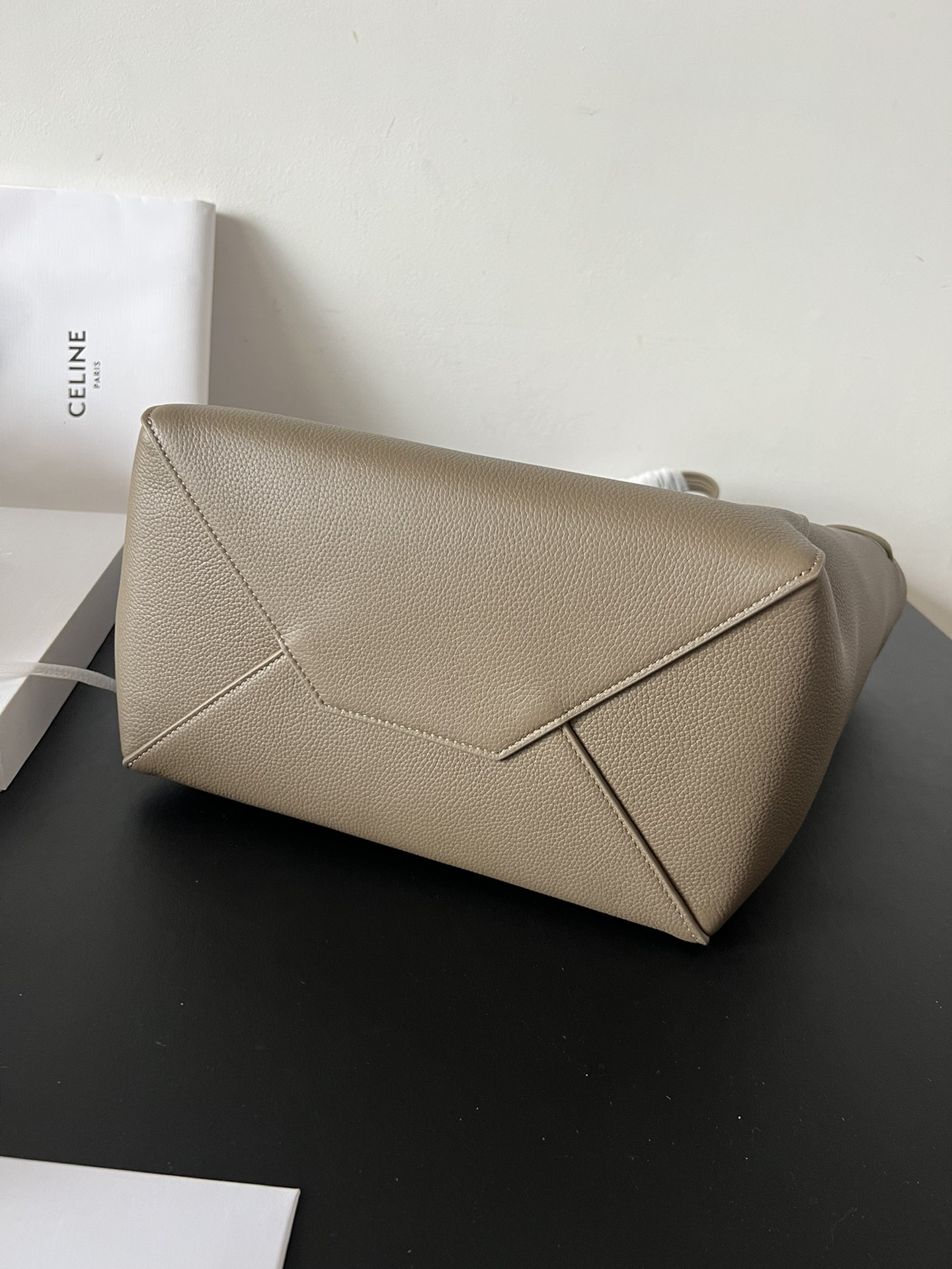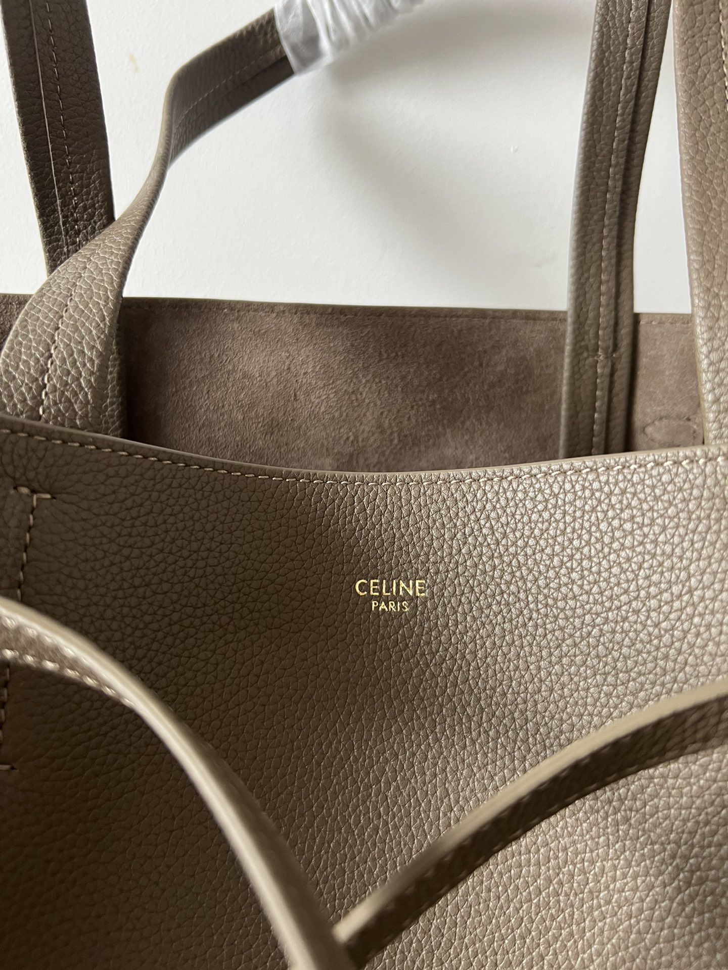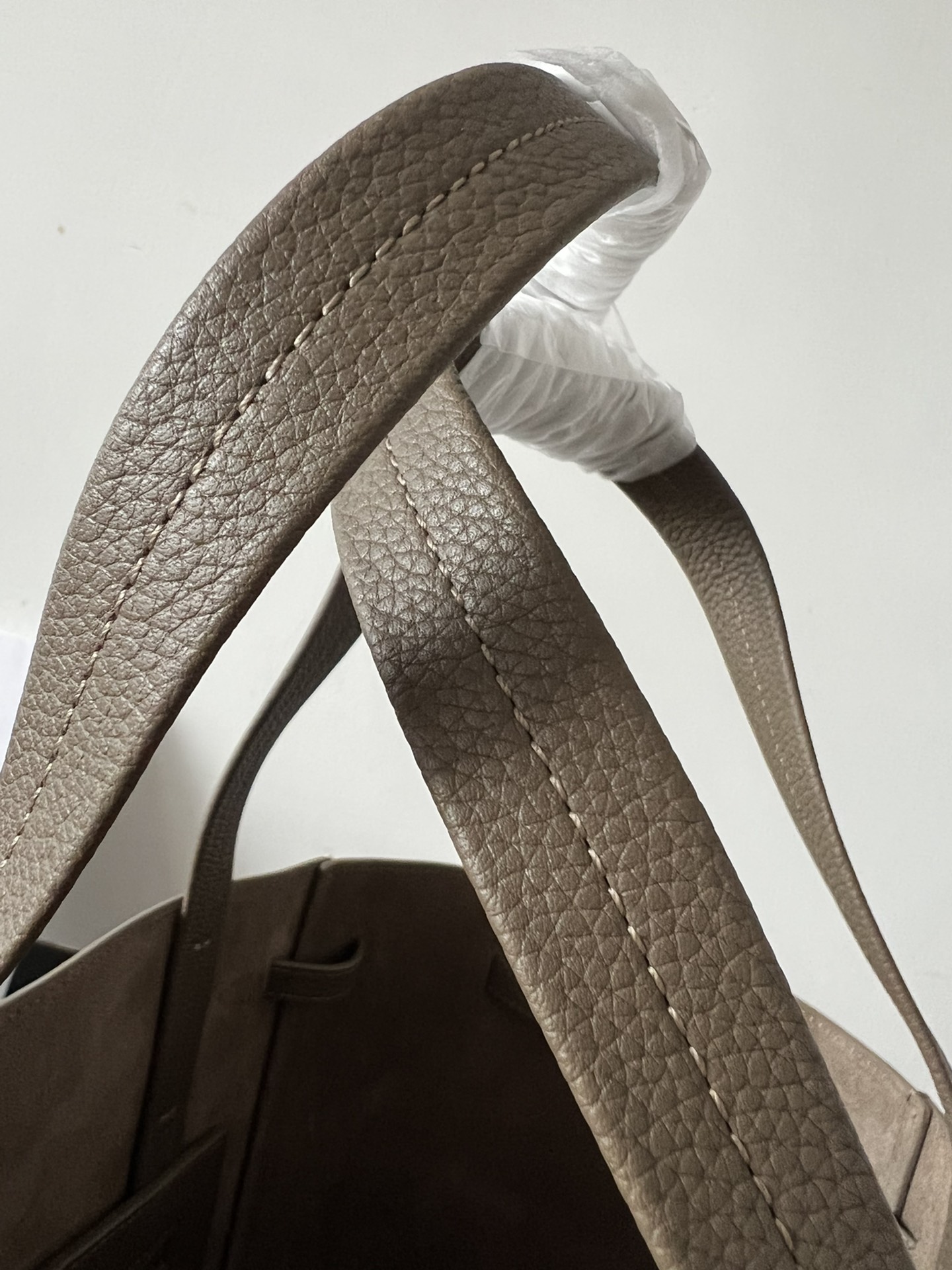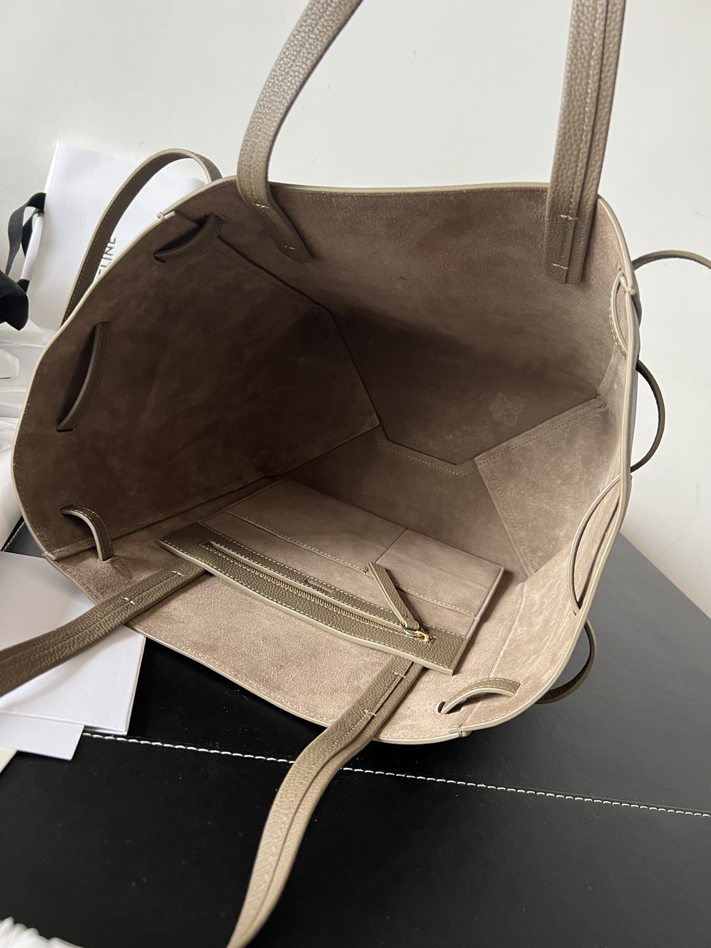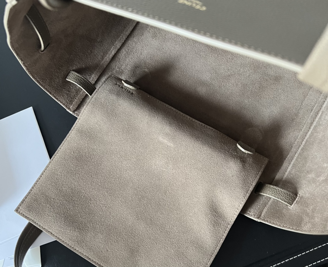27x31x17cmの大容量シルエットで、イタリア産トゴカーフレザーとスエード調内裏を組み合わせたショッパーバッグ。調整可能なレザー抽緒(紐長さ42cm)と上部金具留めを備え、オープントップ/クローズドの2WAYスタイルに対応。メインコンパートメントにジッパーポケット1か所を配置し、ノートPCやA4書類の収納にも最適。