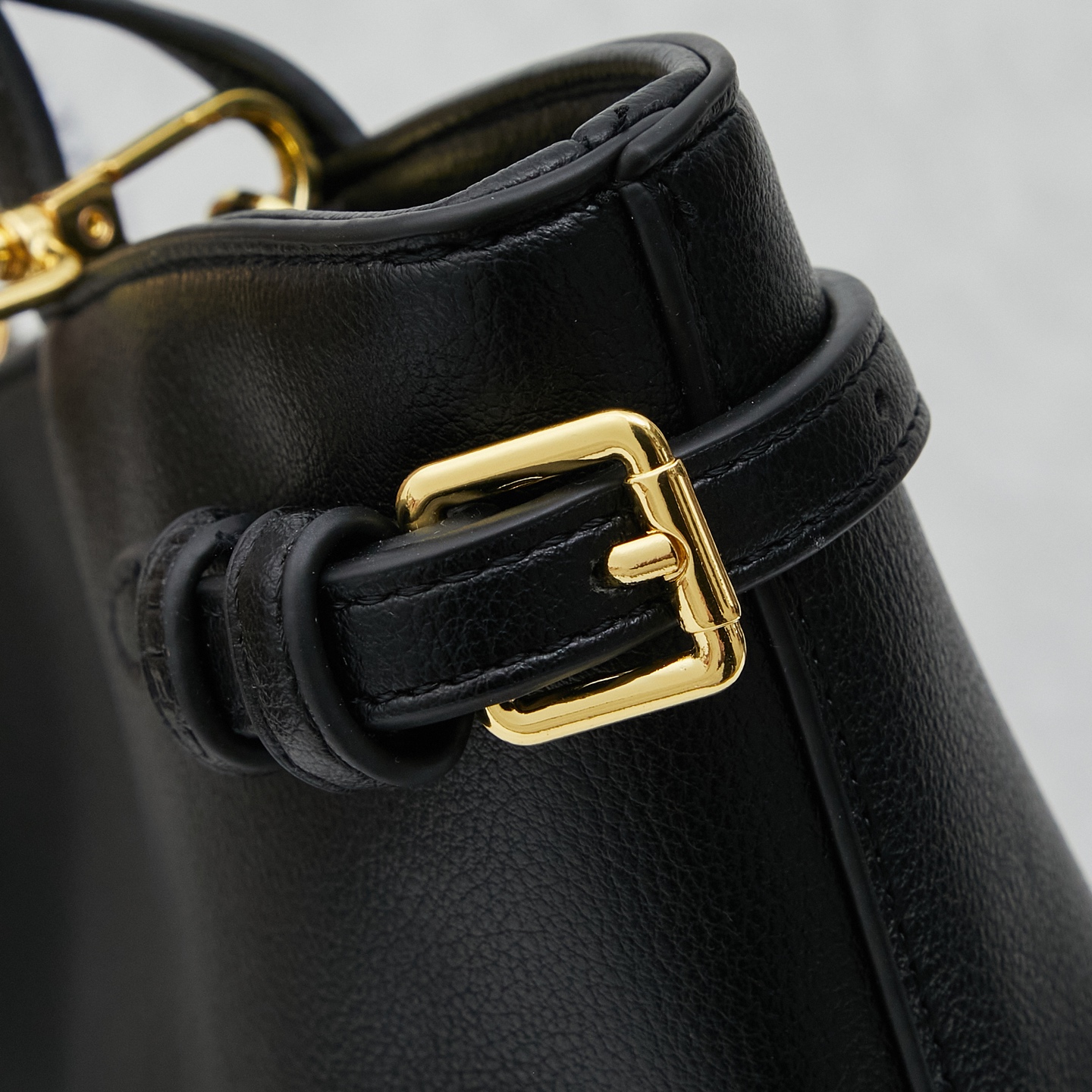 袋口36x底幅20x高さ19x厚み9cmの大型トート(型番3022-1)で、光沢仕上げのボックスカーフと凱旋門モチーフのゴールド金具を採用。マチ9cmの大容量設計に、取り外し可能なレザーショルダーストラップ(調節範囲45-55cm)を装備。メインコンパートメント内にジッパー付ポケットと開放式ポケットを配置し、A4書類やタブレット端末も収納可能。