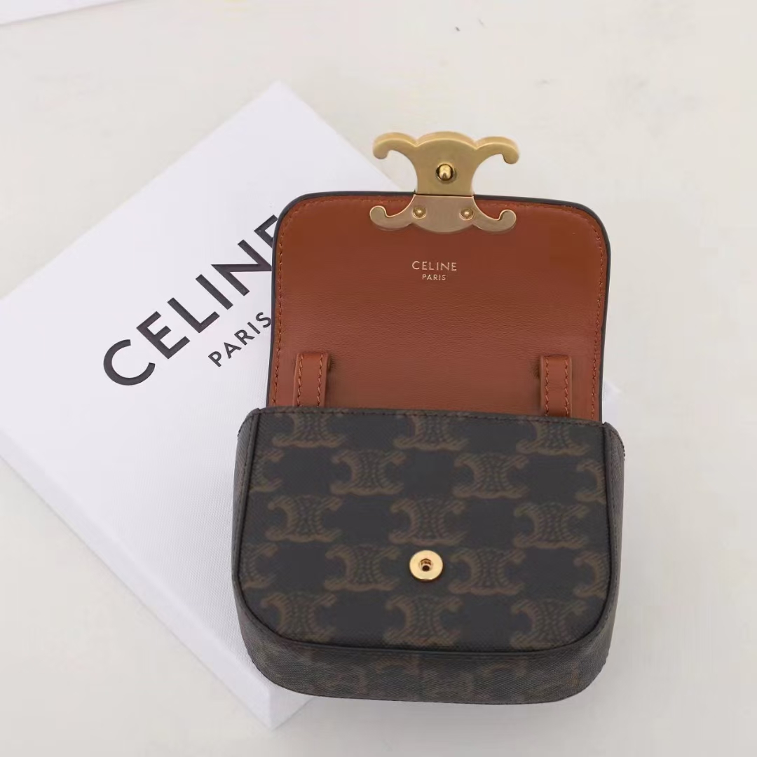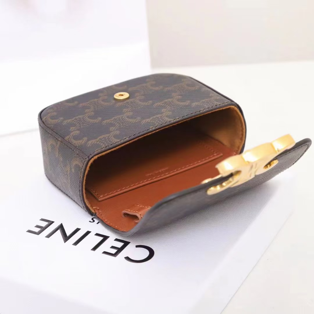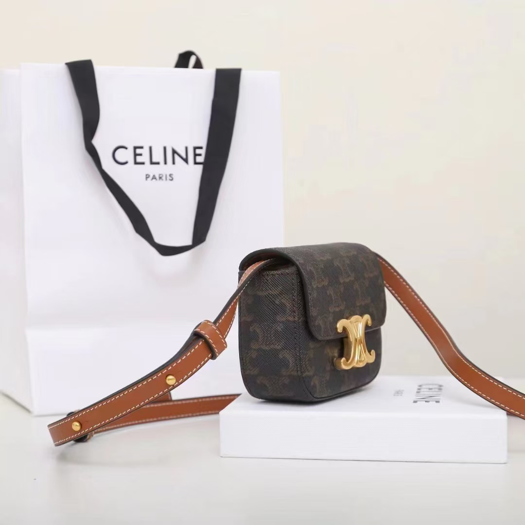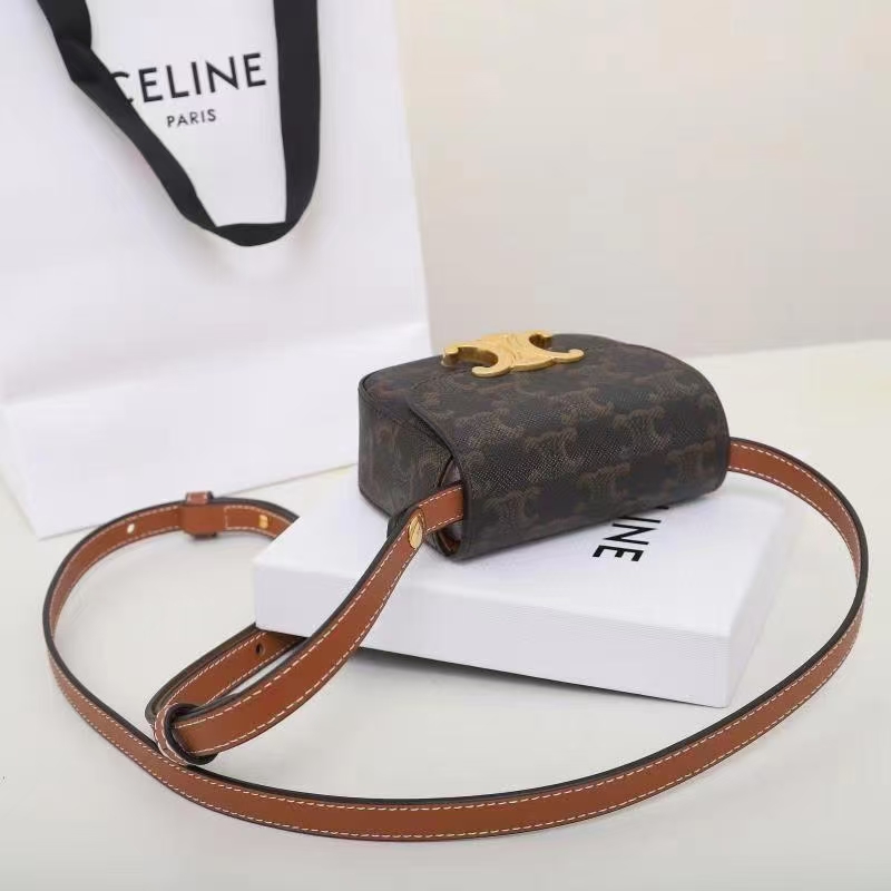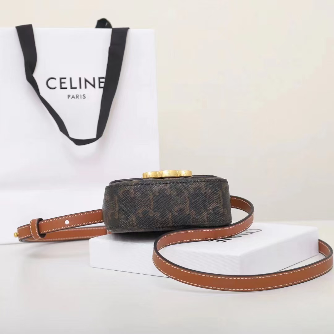 CELINEのアイコニックな「TRIOMPHE」シリーズから生まれた老花プリントの斜挎げバッグ。17×20.5x4cmのコンパクトサイズで、カンヴァス地に凱旋門モチーフをデザインし、牛皮革の縁取りと金色金属部品で高級感を演出。調節可能なレザーショルダーストラップ付きで、日常使いに最適な軽量設計。