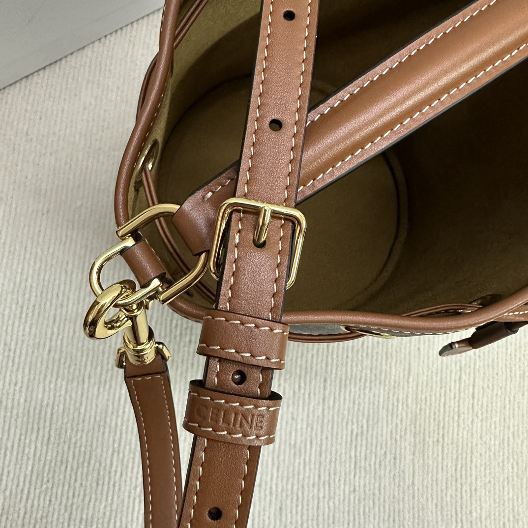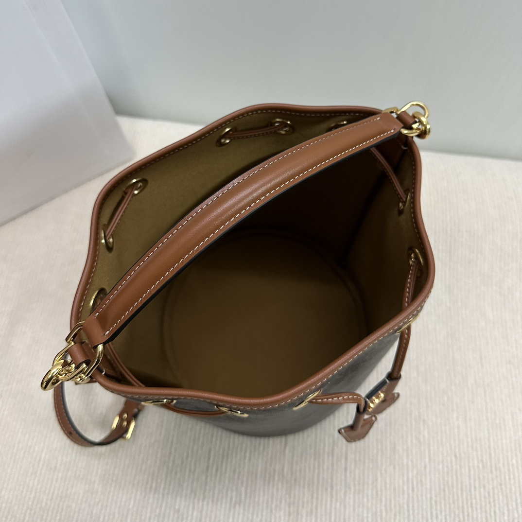 CELINEの2025年新作「TRIOMPHE CANVAS」シリーズは、ブランドのアイコンである老花柄と抽繩デザインを融合させたスタイリッシュな水桶型バッグ。ヴィンテージ風のキャンバス地にレザートリミングを施し、カジュアルかつ高級感のある仕上がり。メインコンパートメントは抽繩で閉じられ、A4サイズの収納が可能。取り外し可能なショルダーストラップ付きで、ハンドバッグからクロスボディまで3WAYで活用可能。