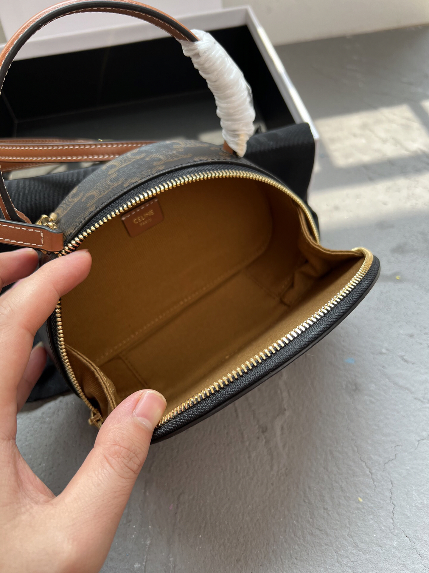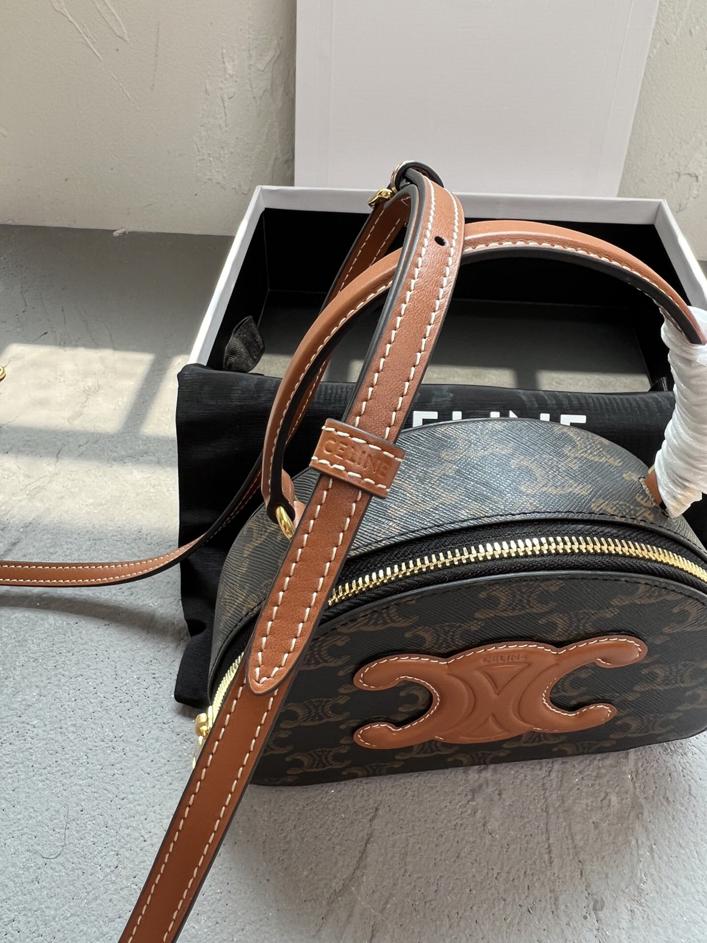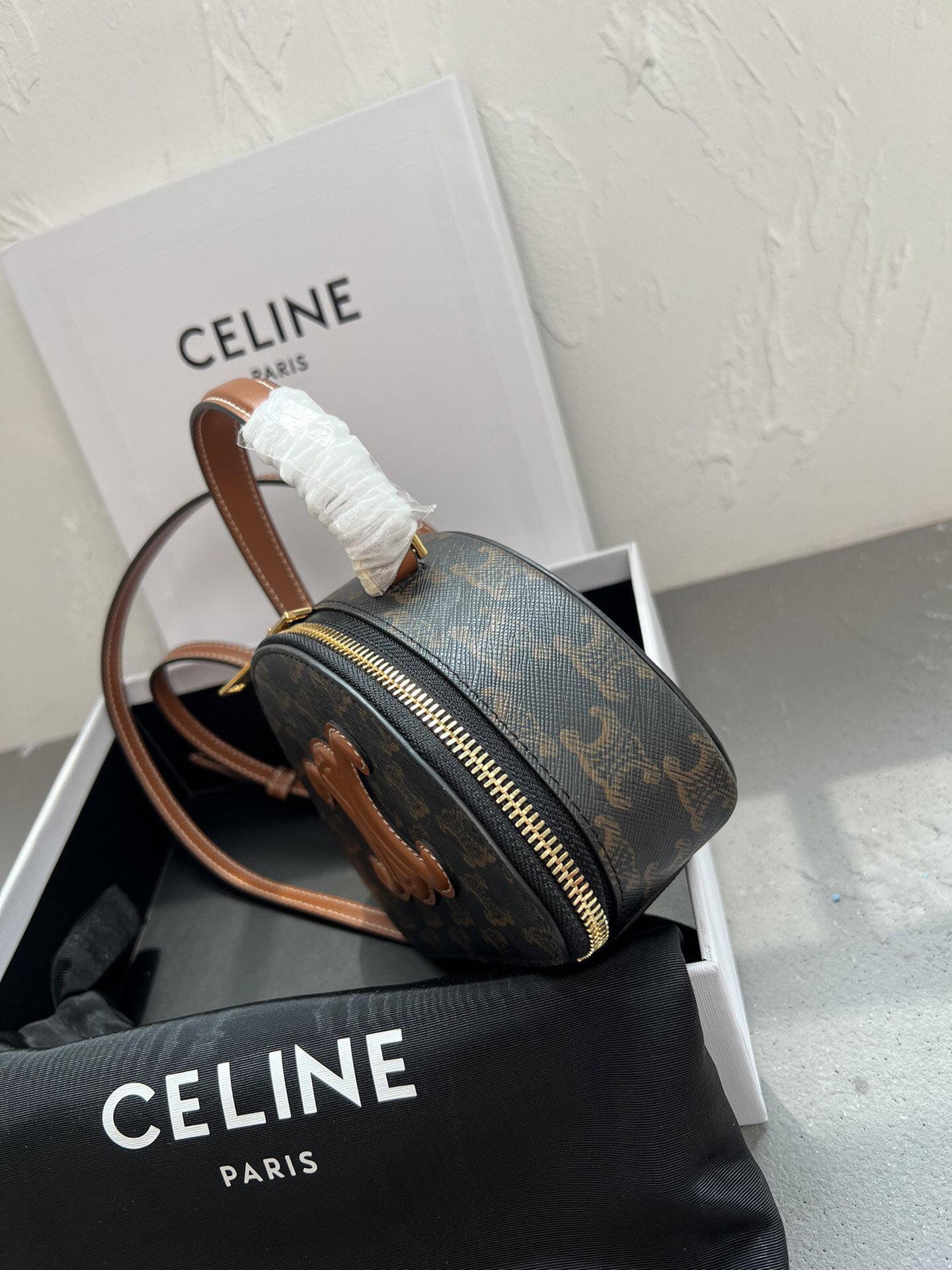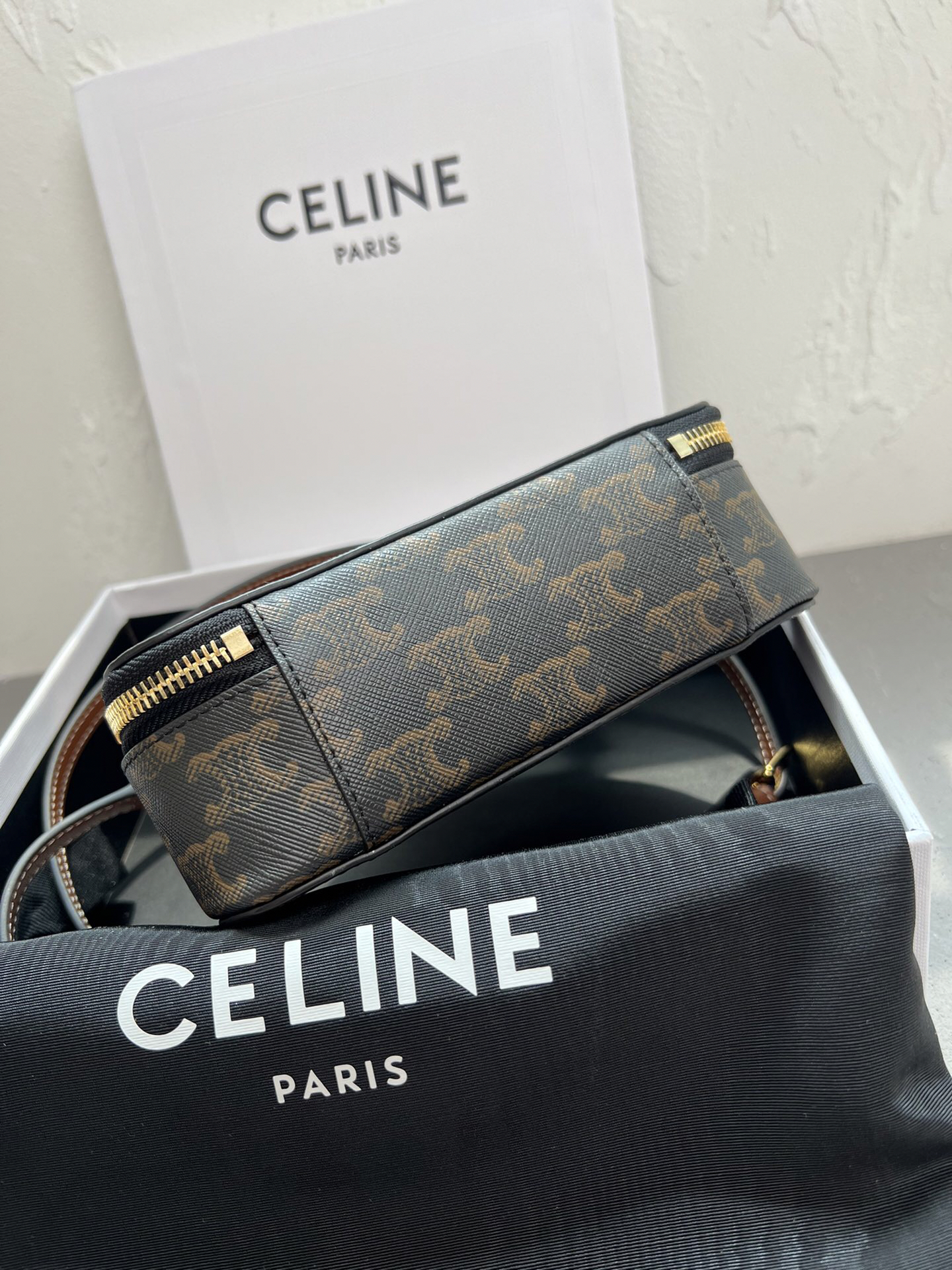 CELINEの2023年秋冬コレクションから登場した半月型シルエットのショルダーバッグ。ブランドのアイコンである「TRIOMPHE」モチーフをキャンバス地にプリントし、中央に浮き彫り加工の皮革ロゴを配したデザインが特徴。6cmの厚みを持つ立体構造で、コンパクトながら実用的な収納力を持ちます。調節可能なレザーショルダーストラップ付きで、手持ちや斜め掛けなど多彩なスタイリングが可能。