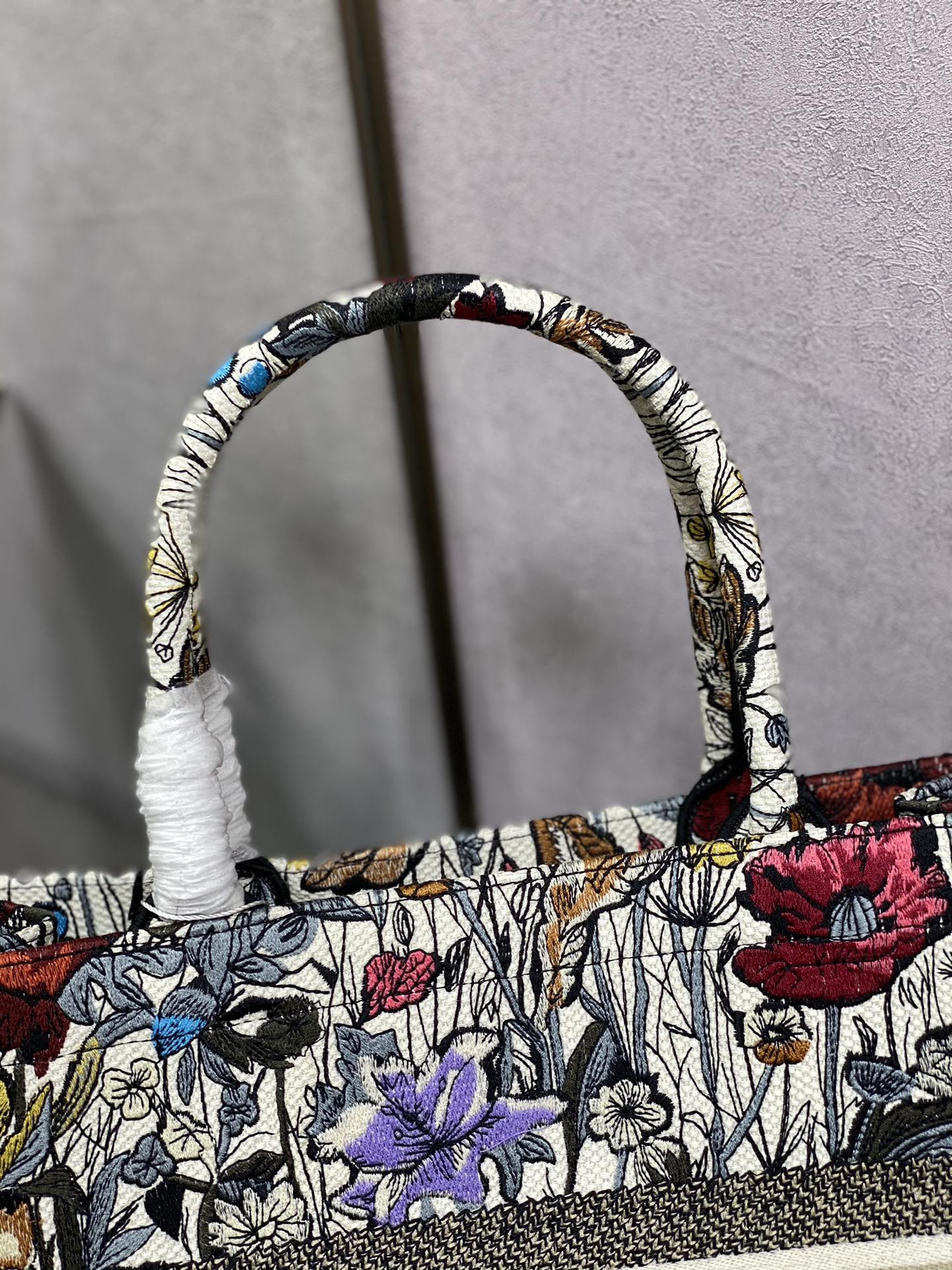 ディオールの象徴的なオブリーク柄をキャンバス地に精巧にプリント。ブルーとミルクホワイトのコントラストがモダンな印象。 -