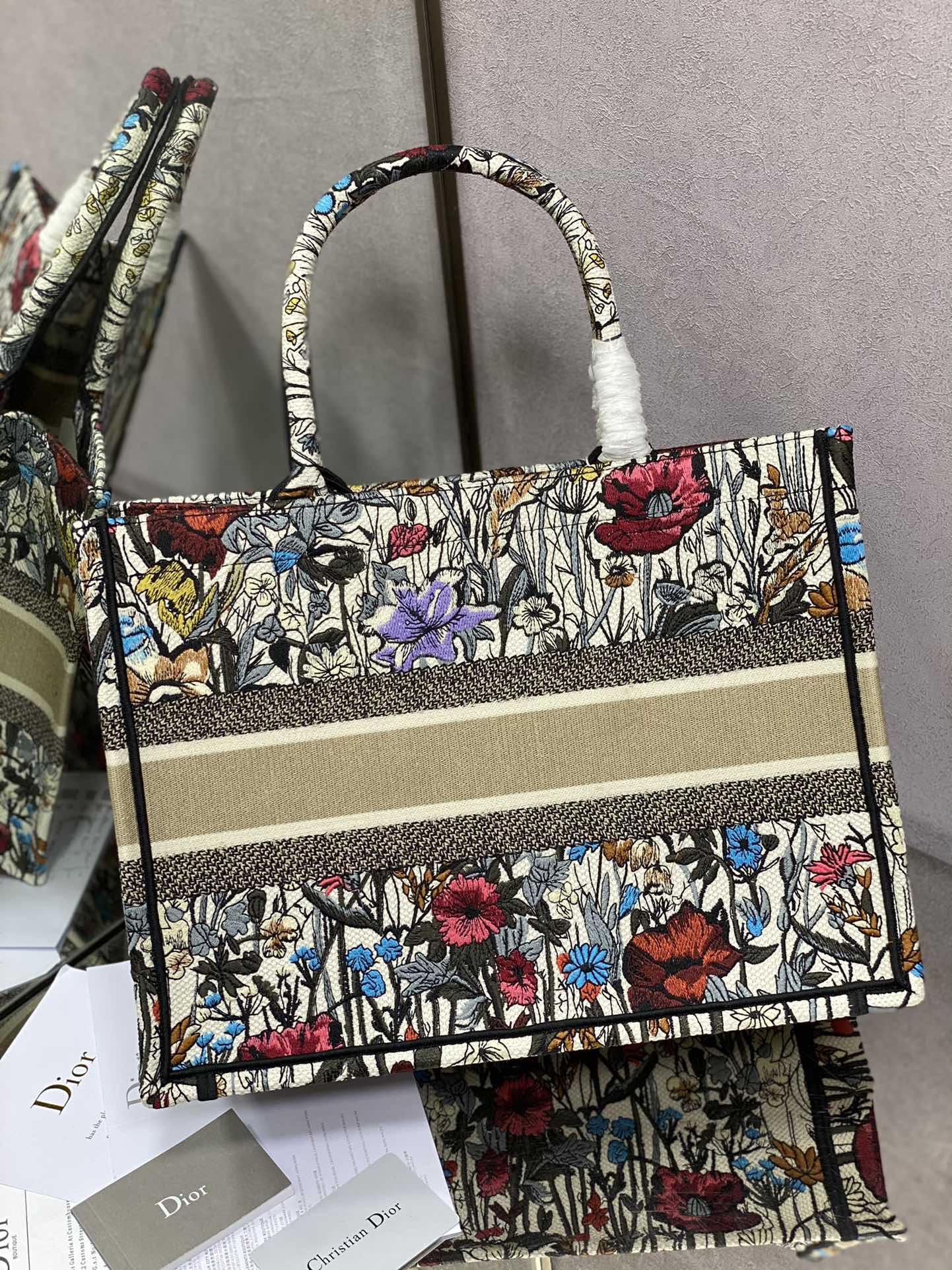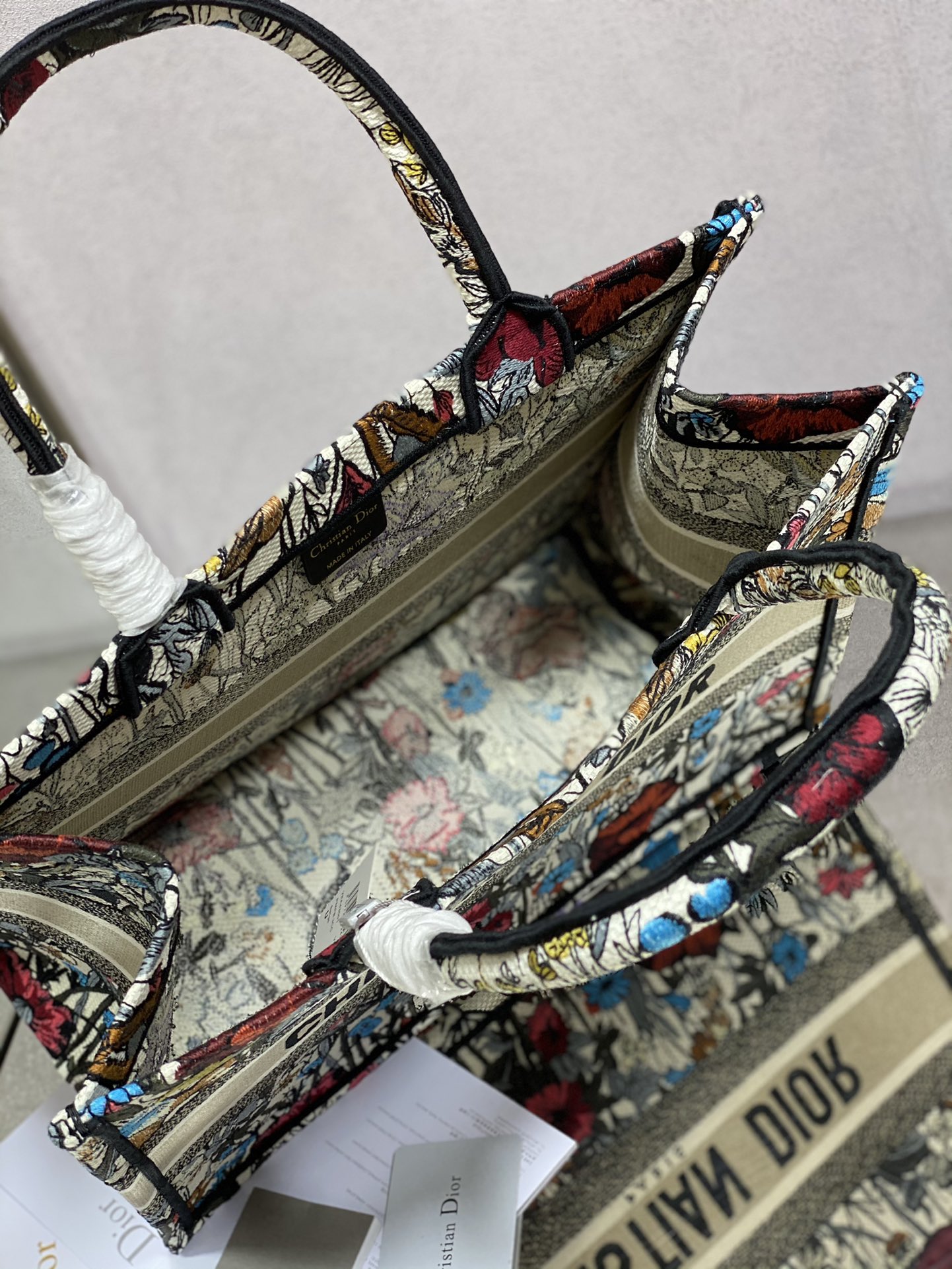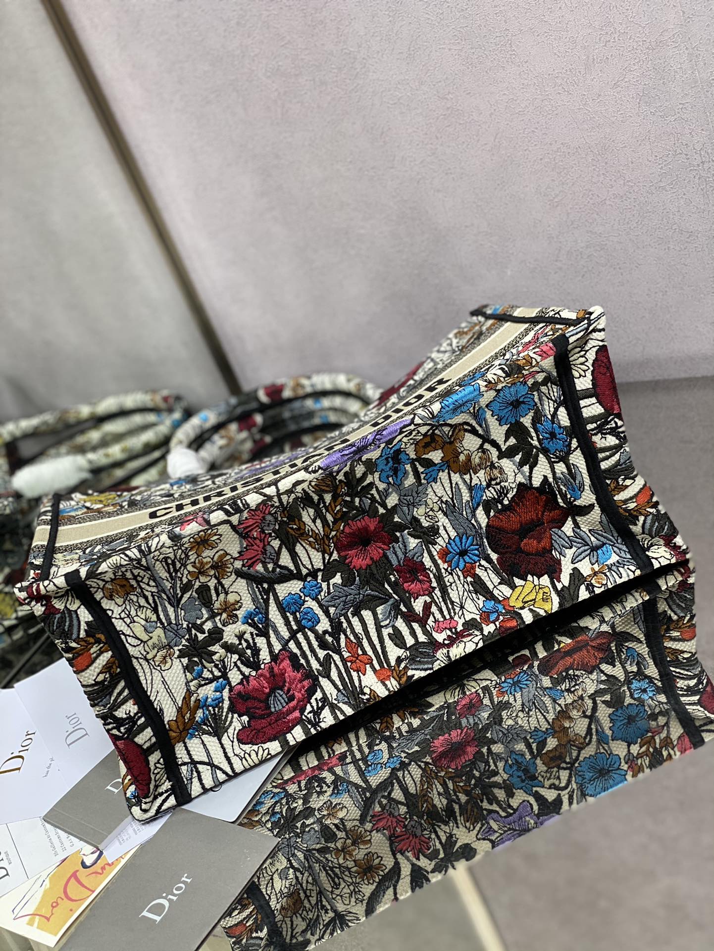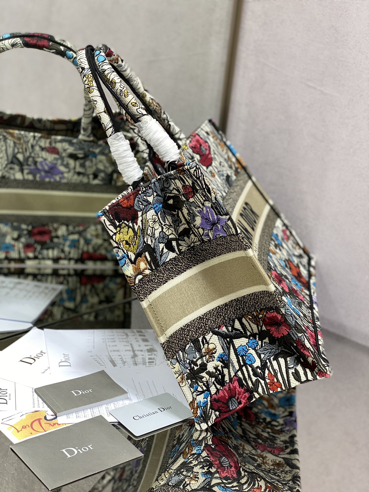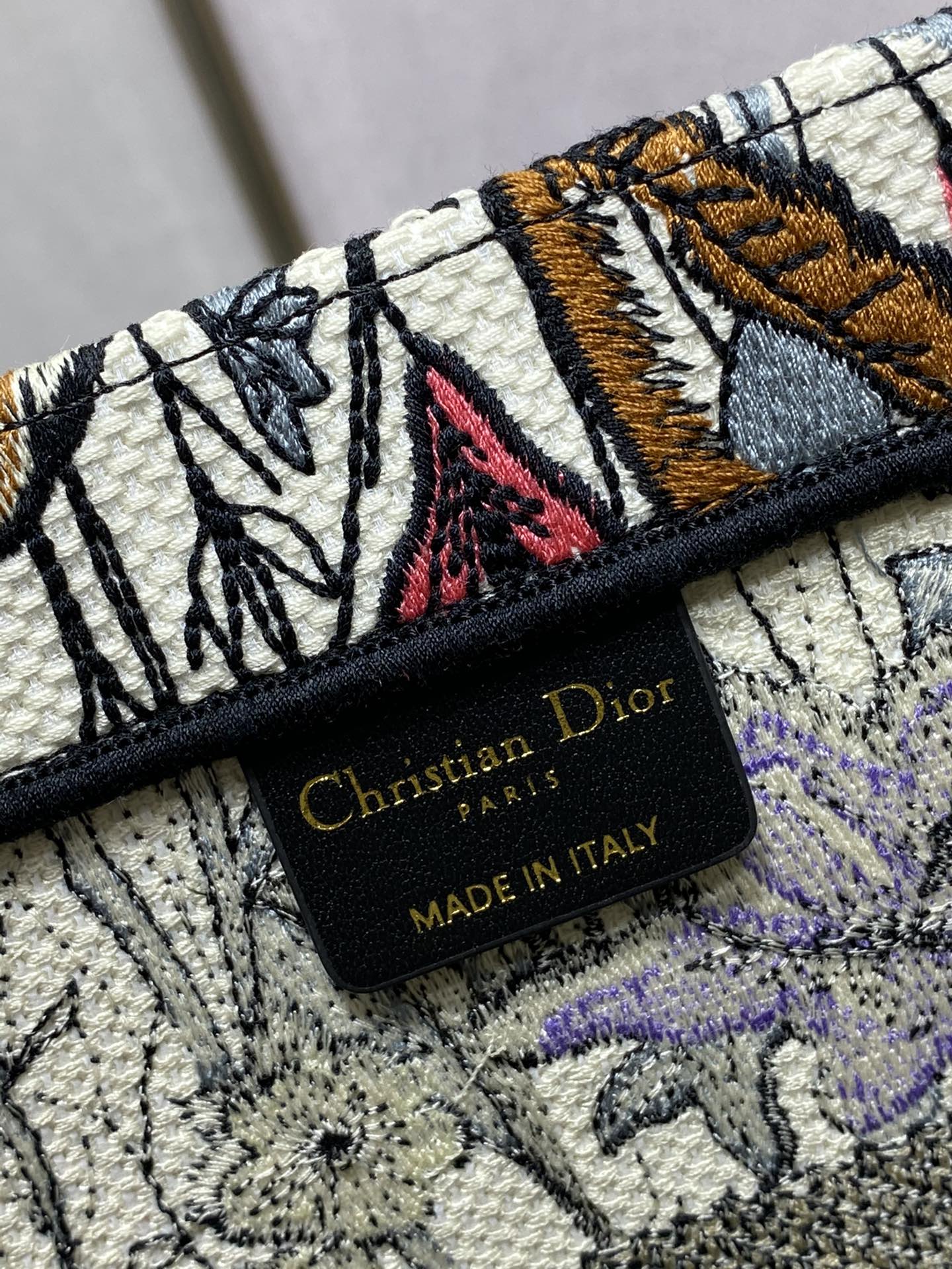 マリア・グラツィア・キウリがデザインした2025年最新コレクションの小号Book Tote13。ブルーオブリークプリントを施したキャンバス地に、ミルクホワイトカーフレザーのトリミングを組み合わせたクラシックなデザイン。サイズは26.5x22x14cmで、スマートフォンや小型財布などの日常小物に最適。トップハンドルと着脱可能なショルダーストラップを備え、手提げ・肩掛けの2WAYスタイリングが可能。イタリア製の精巧な仕上げがディオールの職人技を体現。