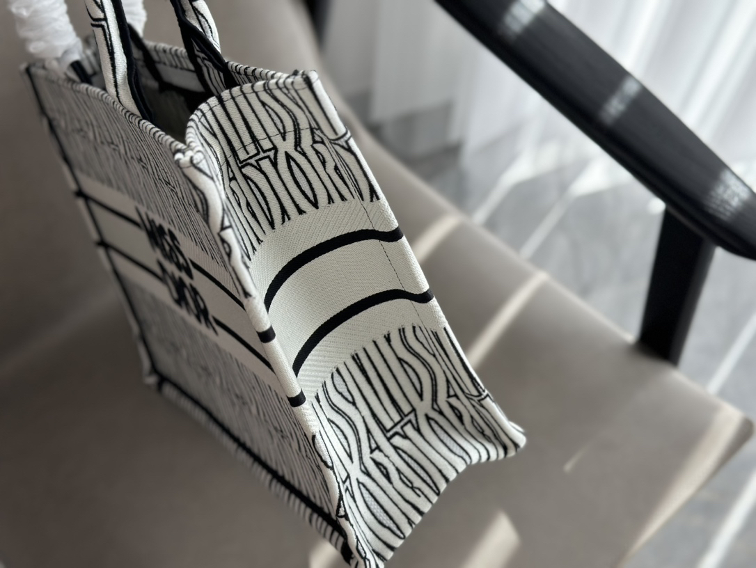 2023年春夏コレクションで登場した「Book Tote」シリーズの最新ショッピングバッグ。ブルーオブリークプリントを施したキャンバス地に、ディオールの象徴的な「CHRISTIAN DIOR」エンブレムを前面に配したデザイン。サイズは36x28cm(大号)で、ノートPCや日常小物を収納可能な広々としたメインコンパートメントを備える。トップハンドルのみのシンプルな構造で、軽量かつ耐久性に優れた仕様。イタリア製の職人技が光る立体刺繍が施された逸品。