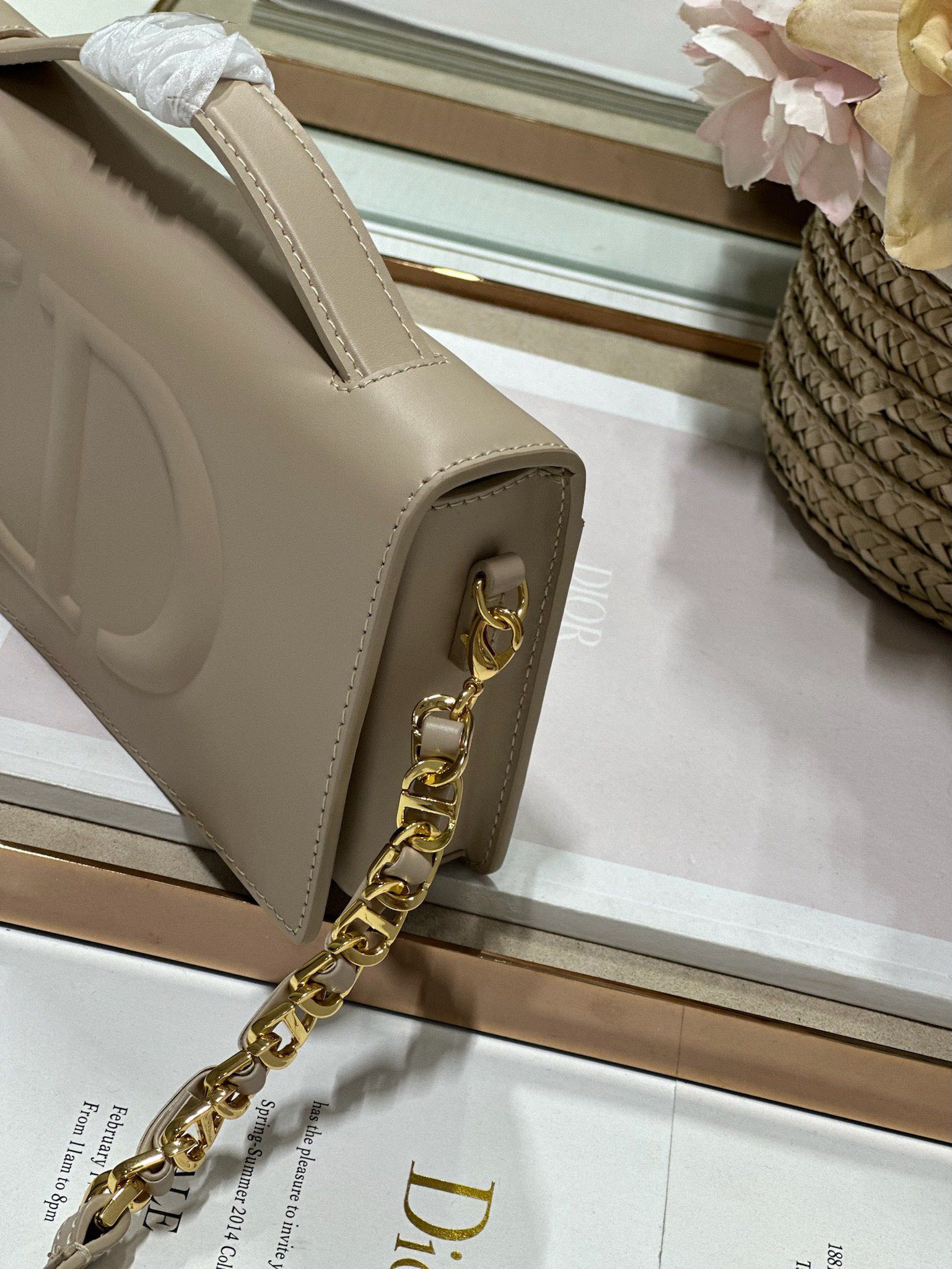クリスチャン・ディオールの象徴的なデザインコードを凝縮したミニチェーンバッグ。ヴィンテージゴールドのメタルCDロゴチャームがチェーンストラップに連なり、1947年のパフュームボトルキャップのアーキテクチャーから着想を得たクラフトマンシップを表現1。滑らかなアプリコットカラーのスムースレザーは季節を問わず上品な輝きを放ち、コンパクトながらカードポケットとファスナー付きインナーポケットを完備。チェーンは肩掛け/斜め掛けの2WAYで、フォーマルからカジュアルまで幅広いスタイルにマッチします。