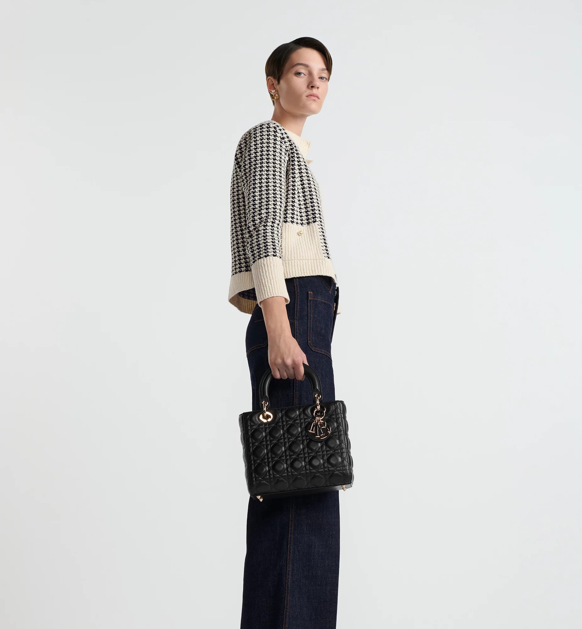 メゾンのビジョンであるエレガンスと美を体現した、「レディ ディオール」バッグ。スタイリッシュで上品なデザインに、タイムレスでモダンな魅力が際立ちます。ラムスキンに「カナージュ」ステッチを施し、瞬時にそれとわかるキルトの質感を演出。ペールゴールドトーンのメタル製D.I.O.R.チャームがエレガントな魅力をプラスします。取り外しが可能な細身のレザー ショルダーストラップを備え、ハンドバッグとしてはもちろん、クロスボディバッグとしてもお使いいただけるミディアムサイズのバッグです。