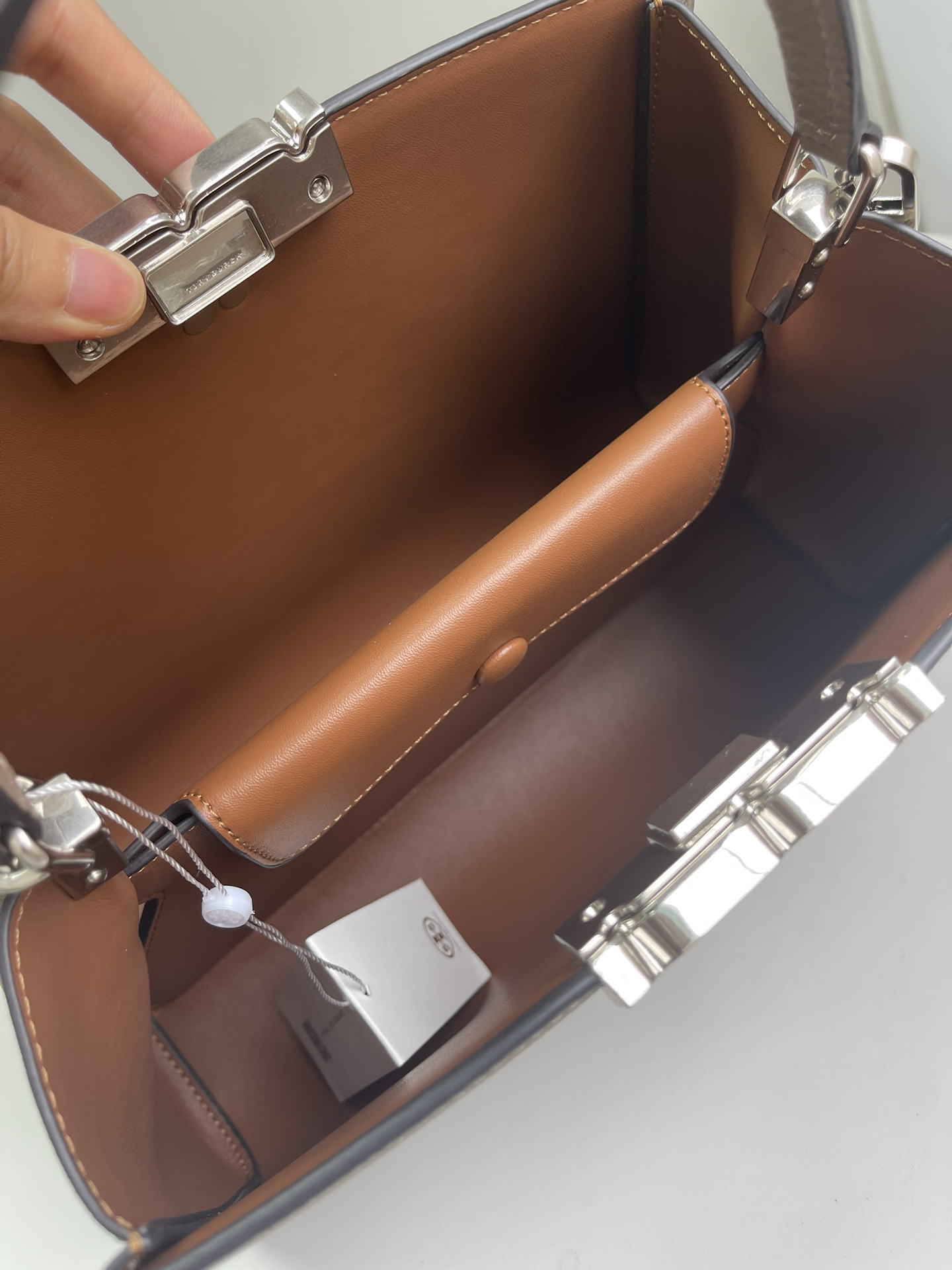 フロントのキルティングダブルTロゴとメタルハードウェアが、ミニマルなデザインに品格あるアクセントを付加。