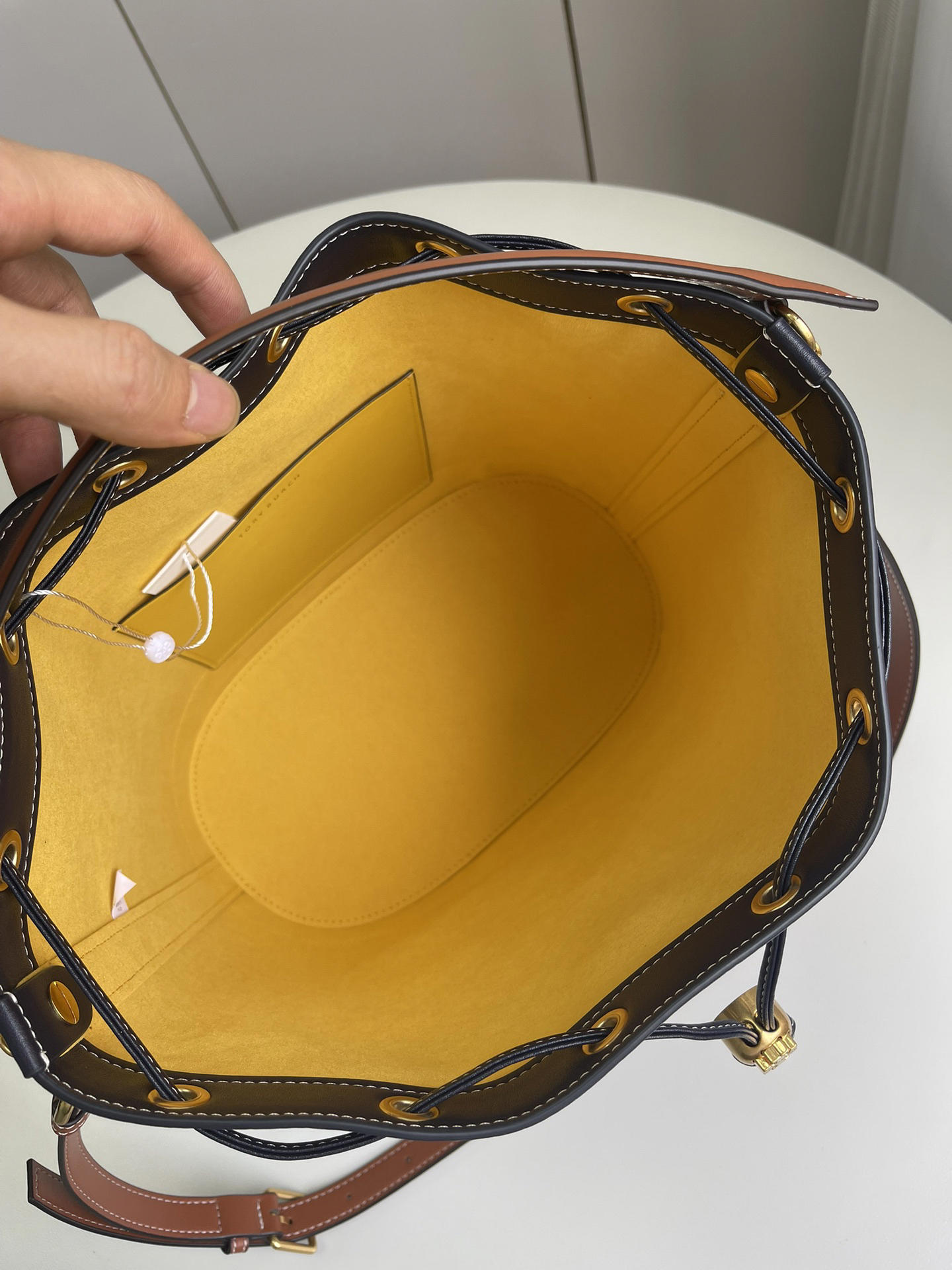 2025年夏秋コレクションのアイコン「T Monogram」シリーズのバケットバッグ。高さ21cmx奥行12cmのスタンダードサイズで、日常使いに最適な収納力。伝統的なペンシルベニア州キルティングをモチーーフにしたモノグラム柄織物と牛皮革の組み合わせが、クラシックかつモダンな雰囲気を演出。金属製ダブルTロゴボタンで抽ひもの長さを調節可能。内側はスエード調合成皮革で仕上げられ、取り外し可能な斜め掛けストラップ付きで2WAYスタイルが楽しめます。