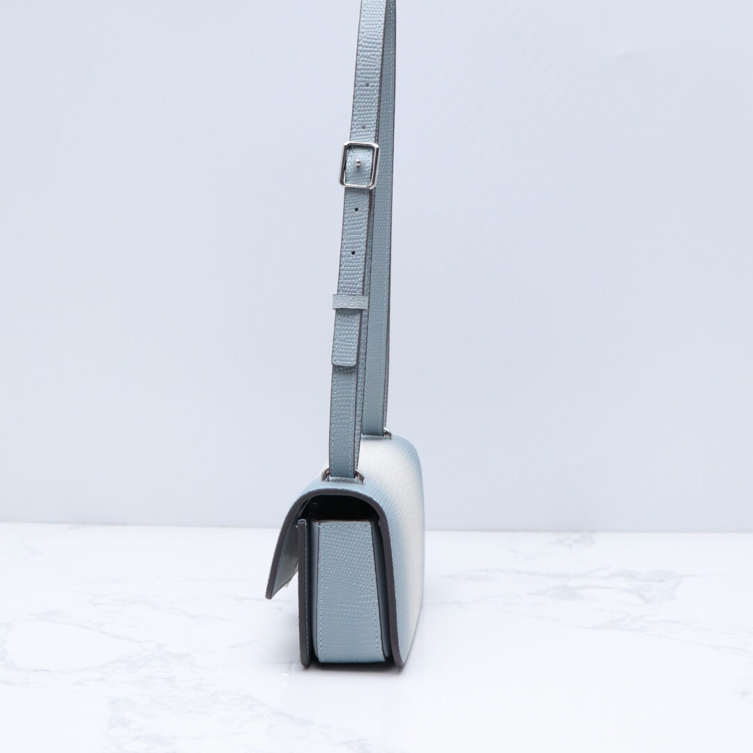 BRITTENシリーズのトートバッグは、クロコダイルエンボス加工の牛皮を使用した高級感あふれるデザインが特徴です。約20x12x7cmのコンパクトサイズながら、スマートフォンや薄い財布など日常必需品を収納可能。取り外し可能な長さ調節可能なショルダーストラップを備え、手提げ・斜め掛けの2WAYスタイルに対応。メタリックなダブルTロゴがシンプルなシルエットに洗練されたアクセントを加えます。