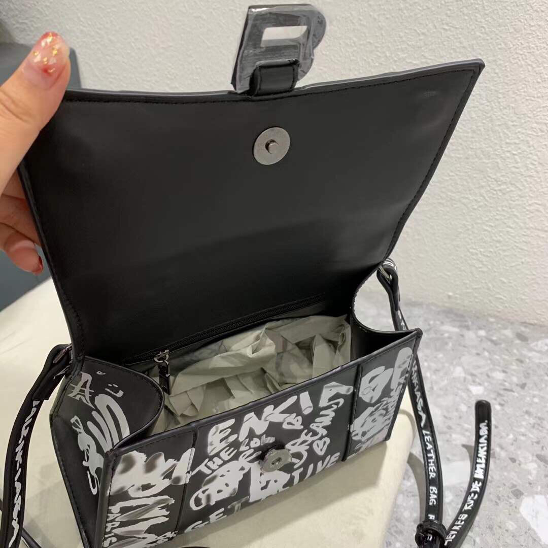 Balenciagaの限定Hourglassシリーズは、クリエイティブディレクターDemna Gvasalia直筆の「Balenciaga」「Paris」グラフィティが特徴。XSサイズ(19×11.5×7.5cm)のサンドイッチ型ボディに、光沢あるピンク/ブラックのカーフレザーを使用。マグネットクロージャー付きフラップと55cm調節可能なショルダーストラップを備え、手提げ/斜め掛けの2WAYで使用可能。各製品ごとに異なるハンドドローイングが施され、一点物のコレクターズアイテムとしても価値があります。