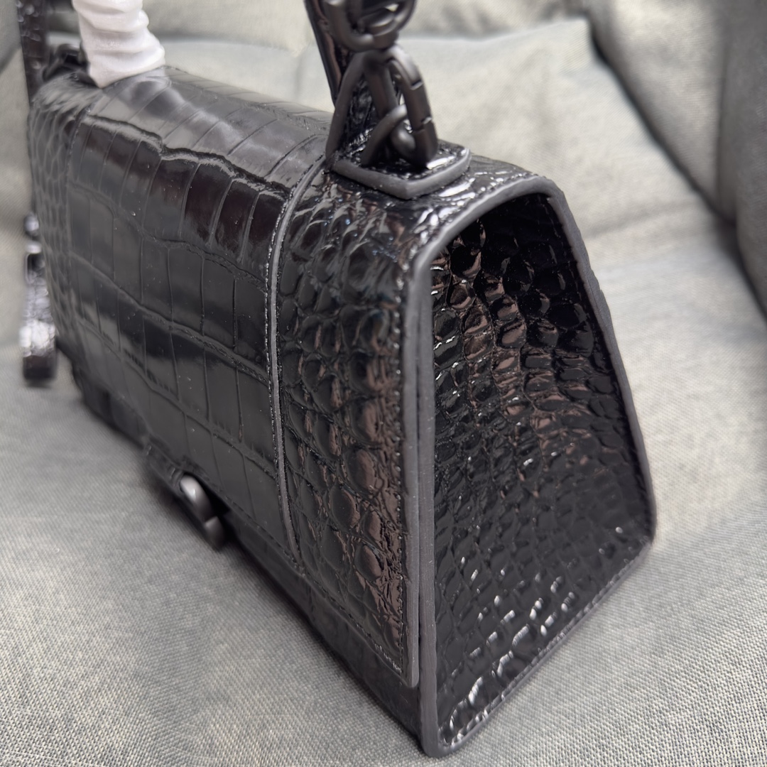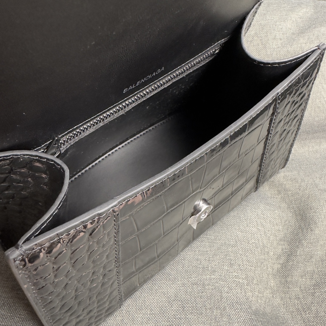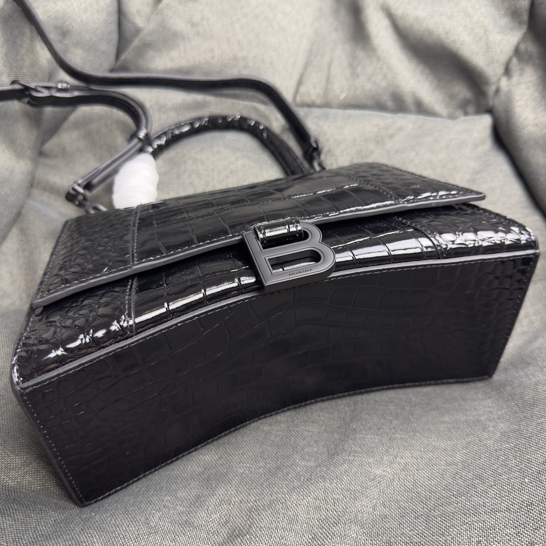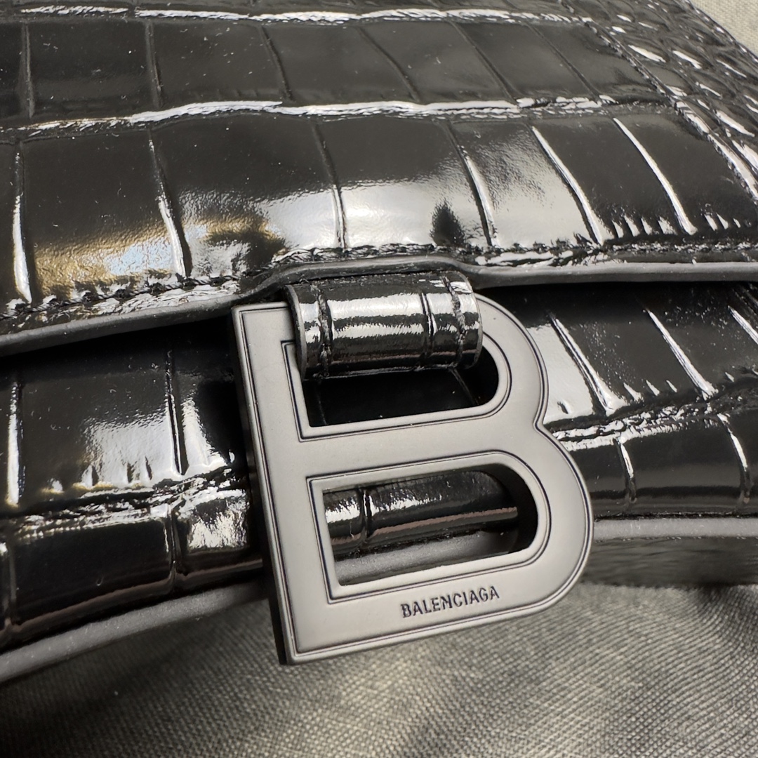 バレンシアガの象徴的な「Hourglass」シルエットを採用したハンドバッグ。滑らかなクロコダイルエンボス加工の牛皮革を使用し、曲線的な底部とアーチ型ハンドルが特徴です。磁気留め具付きのフラップにはヴィンンテージ加工の「B」ロゴが輝き、背面ポケットと内部ファスナーポケットを備えた実用性の高いデザイン。Nappa羊皮革裏地が高級感を演出し、約22.8×14.9×9.9cmのコンコンパクトサイズで日常使いに最適です。
