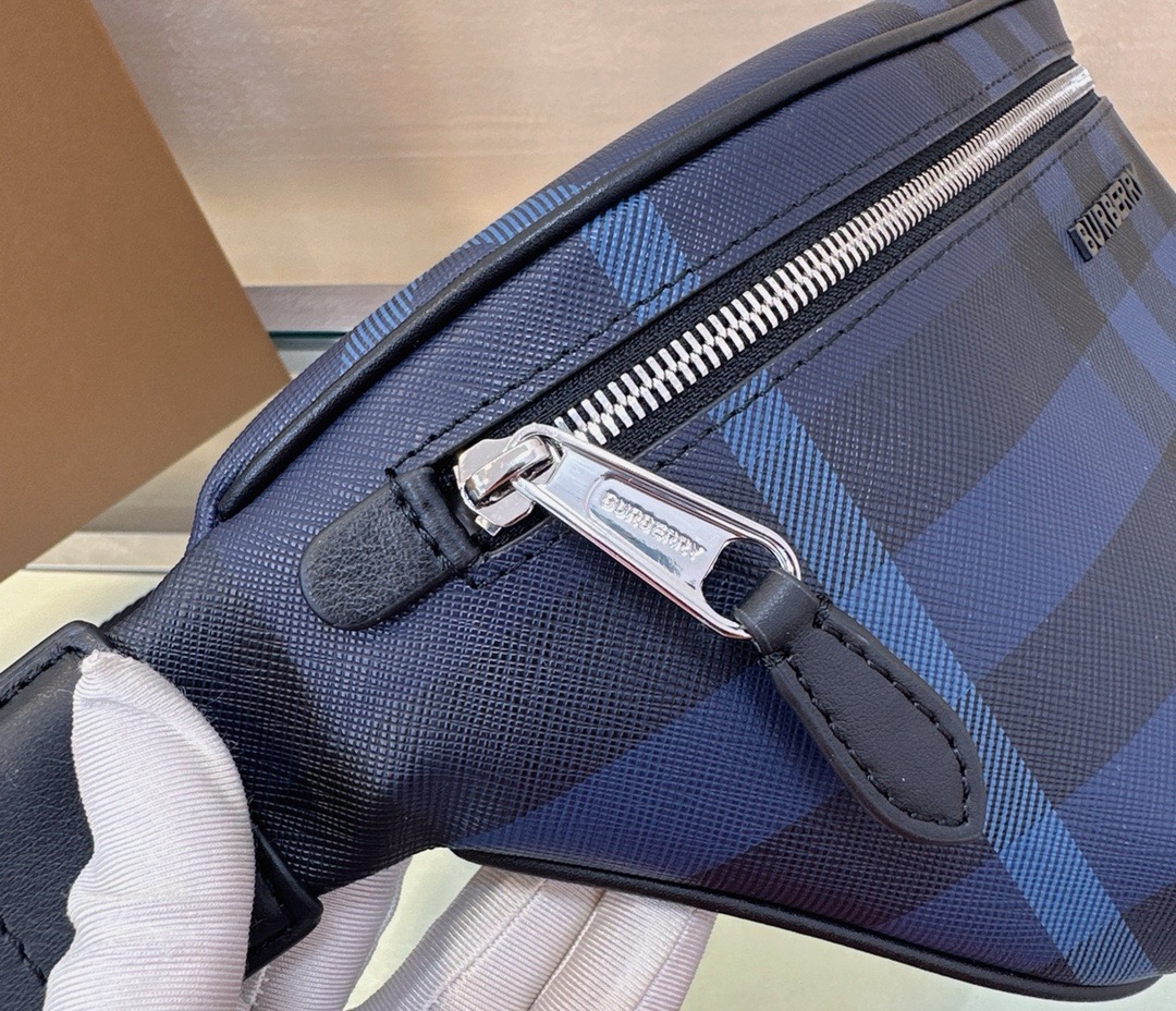 ディープブルーの防水ガバーディン素材で仕立てられた立挺シルエットのウエストバッグ。37.5x17x8cmの大容量設計で13インチタブレットやA5ファイルを収納可能。内側には1924年商標登録のクラシックチェック裏地を採用。アンティークゴールド調の調整可能ストラップ(70-120cm)により、腰位置/ショルダー/クロスボディの3WAYスタイルを実現。軍用トレンチコートの機能美をモダンに継承した実用性。