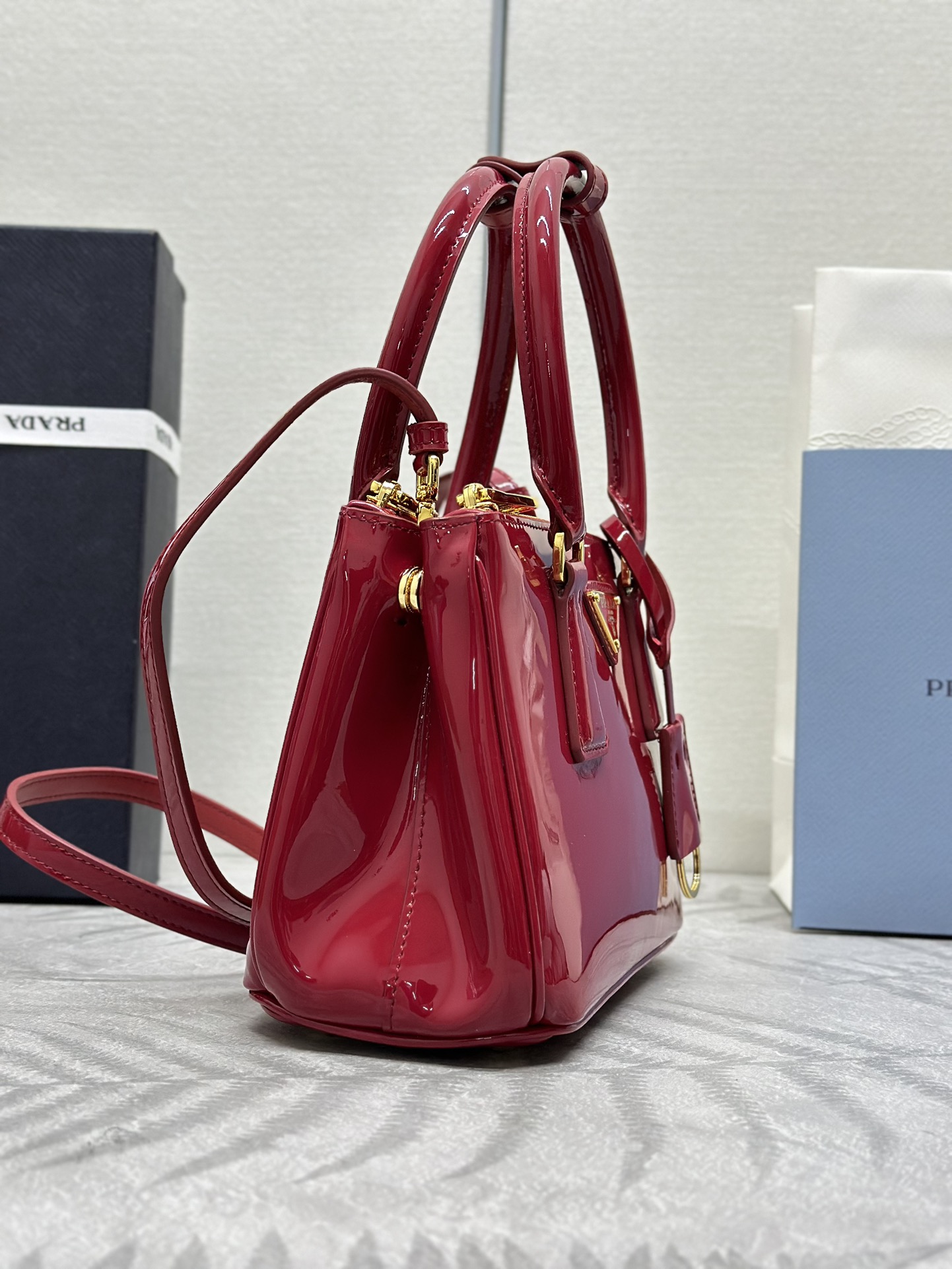 20x15x9.5cmのコンパクトシルエットに高光沢ラッカードレザー(漆皮)を採用。