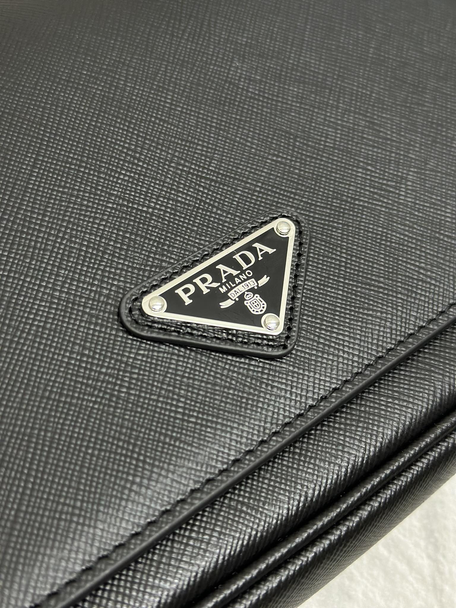 プラダ独自の十字紋加工レザーを使用し、傷や汚れに強い耐久性を実現。 -