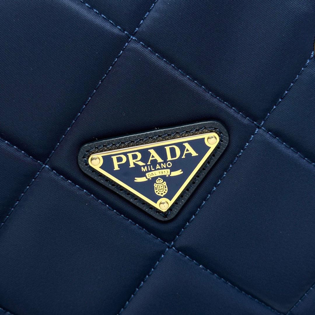 プラダの「ダイヤモンドキルトチェーンバッグ」は、再生ナイロン生地に職人手作りの菱型キルト縫製を施したクラシックデザイン。35cmx25cmx9.5cmの大型ボディにマルチウェイ着用が可能な脱着式ショルダーチェーン(黒金カラー)を装備。メインコンパートメントはファスナー開閉式で収納力抜群。内側にスリットポケットを配置し、機能性とビンテージ感覚を融合。シルバーのトライアングルロゴがモダンなアクセントを添えます。