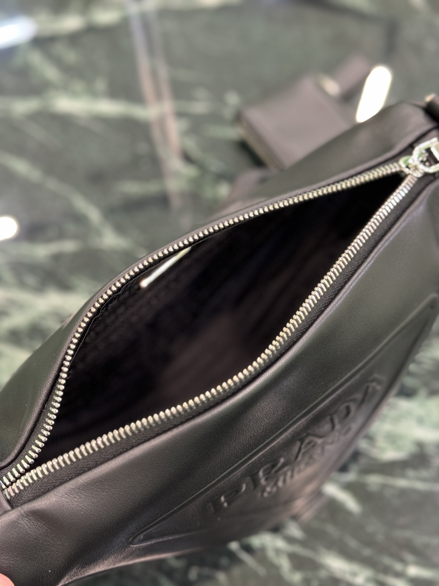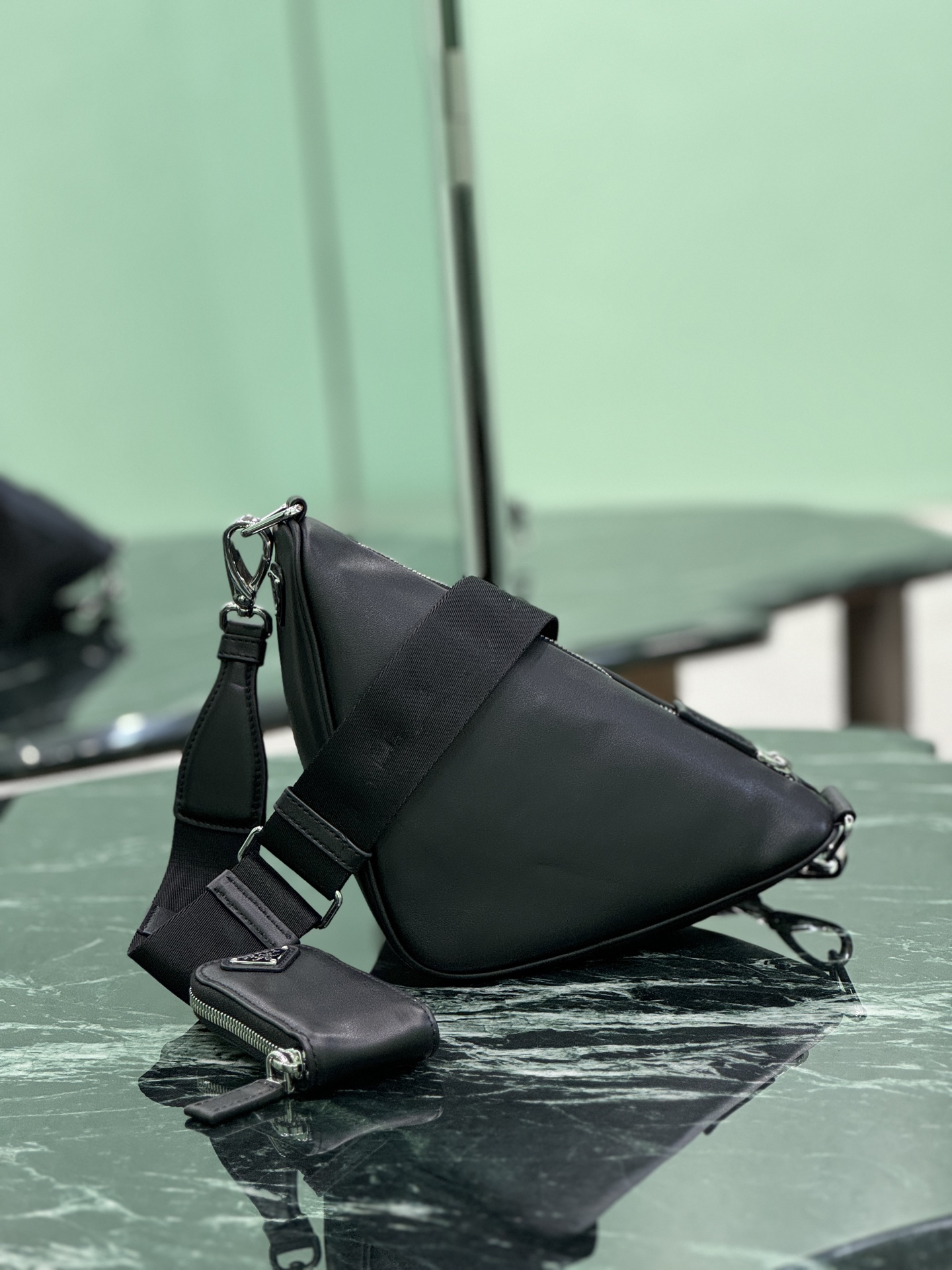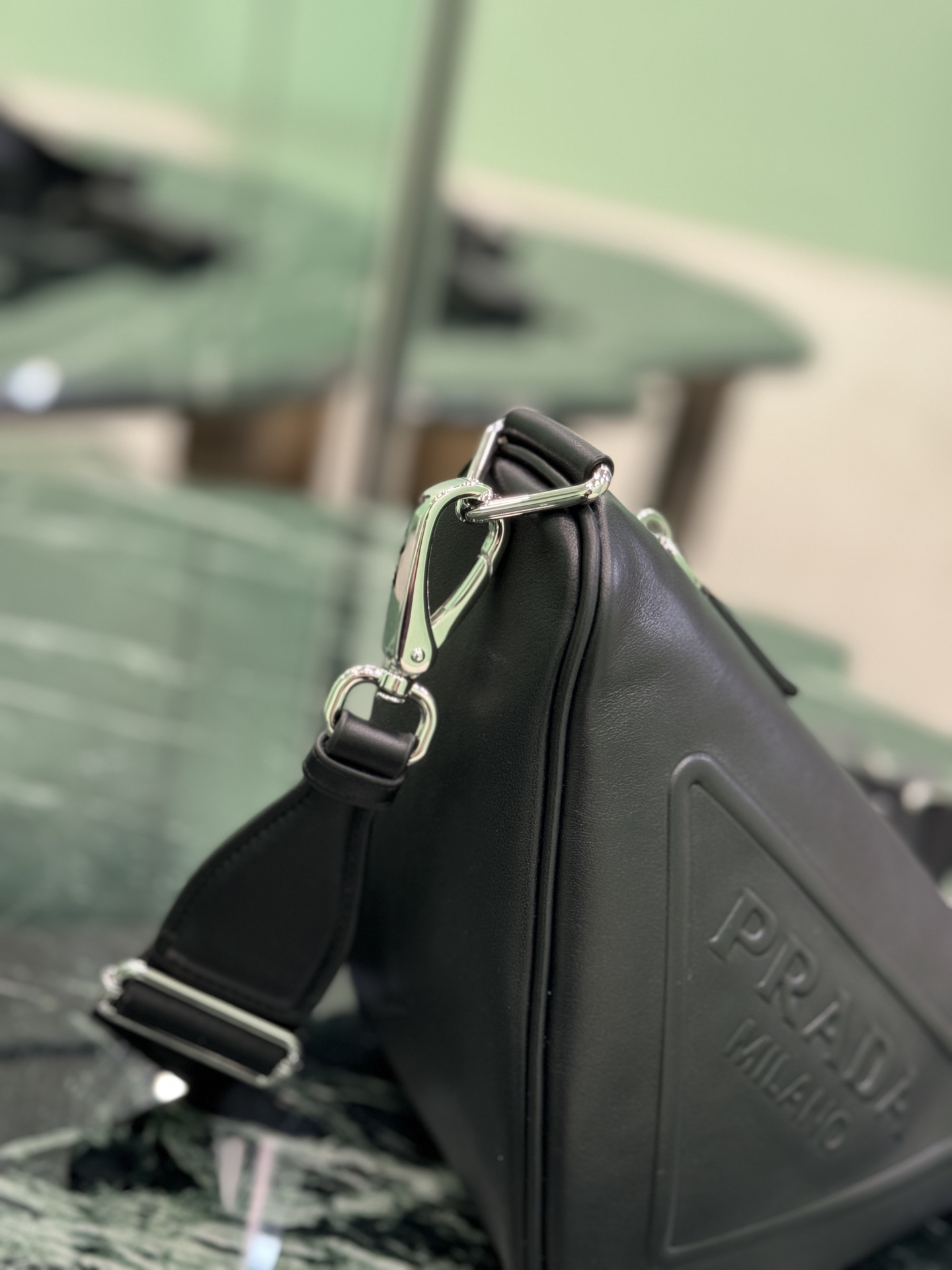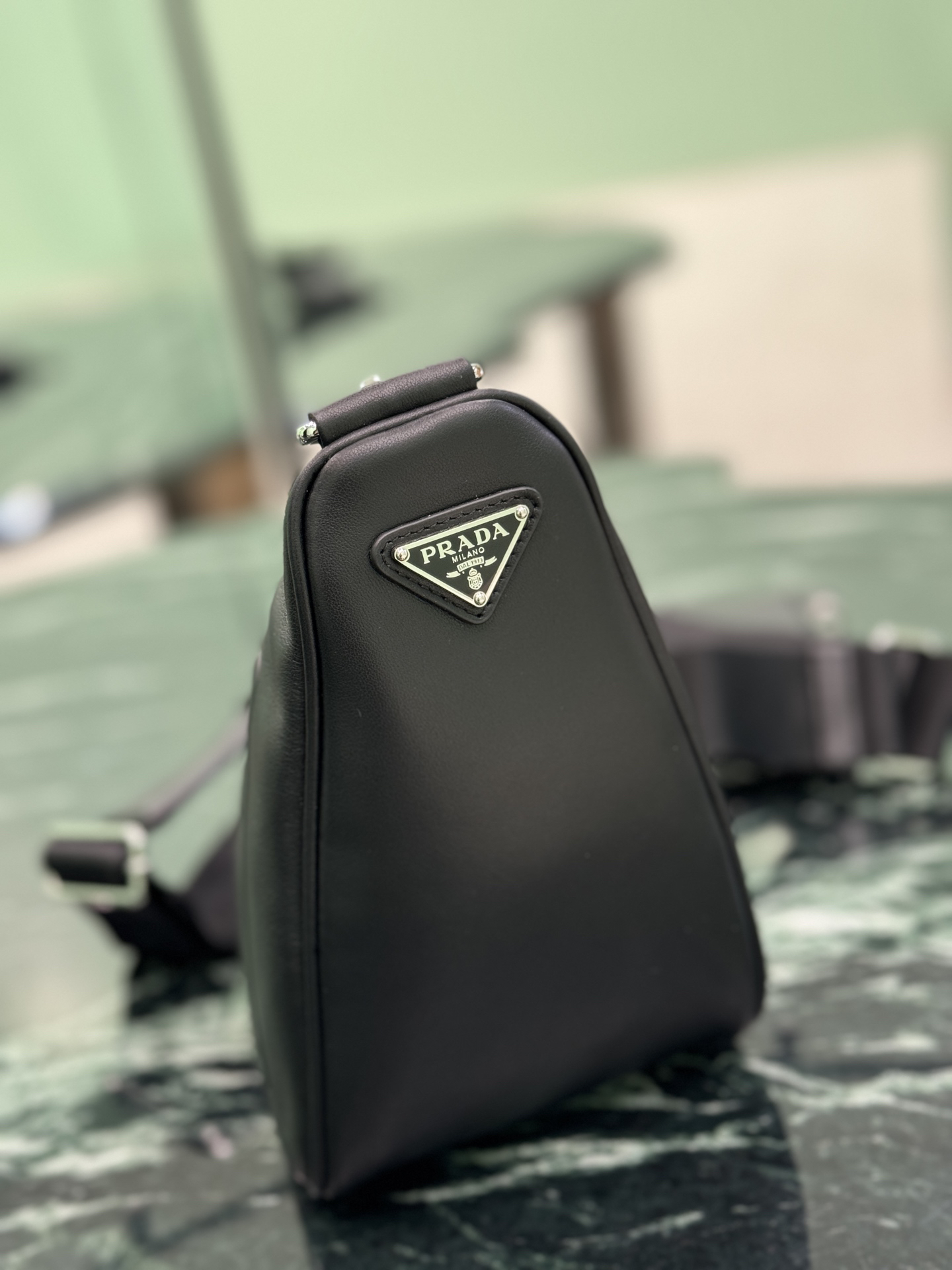 側面にプラダの歴史を刻む三角形エナメルロゴを配置。前面には同色エンボスロゴを施し、過剰な装飾を排した「控えめなブランドング」を実現。 -
