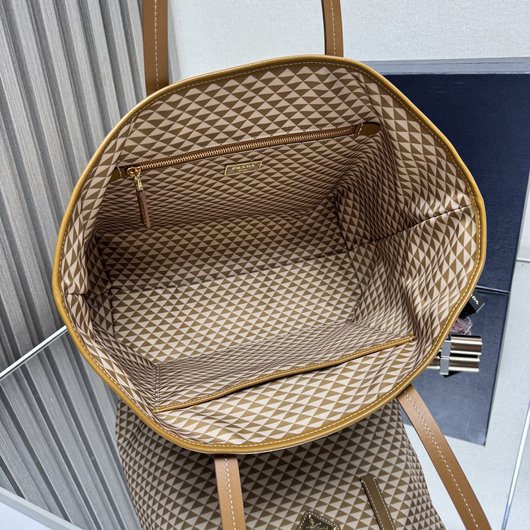 金メッキのプラダロゴ付きハードウェアと、なめらかなレザートリミングが高級感を強調。シームレスな縫製で仕上がりの美しさにこだわり。 -