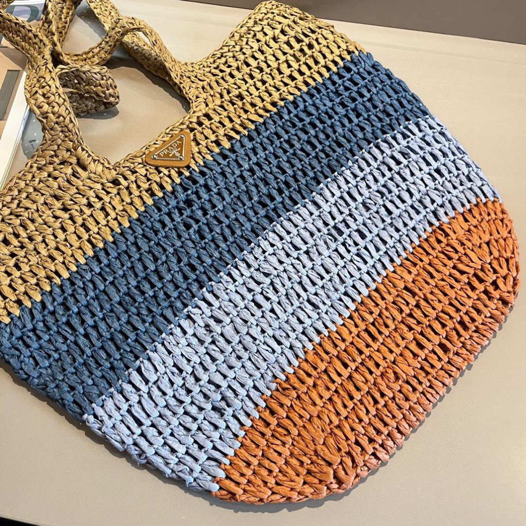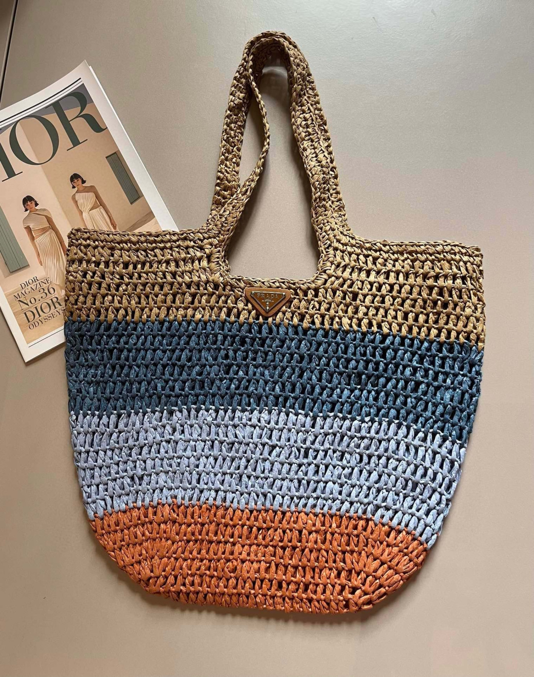 ラフィアの自然な質感にプラダ定番のレザーストラップと金具を組み合わせ。リゾート感覚とブランドのラグジュアリーアイデンティティを両立。 -