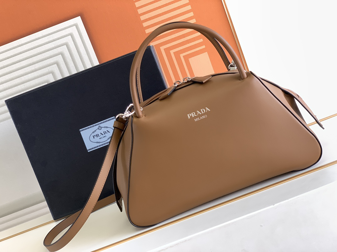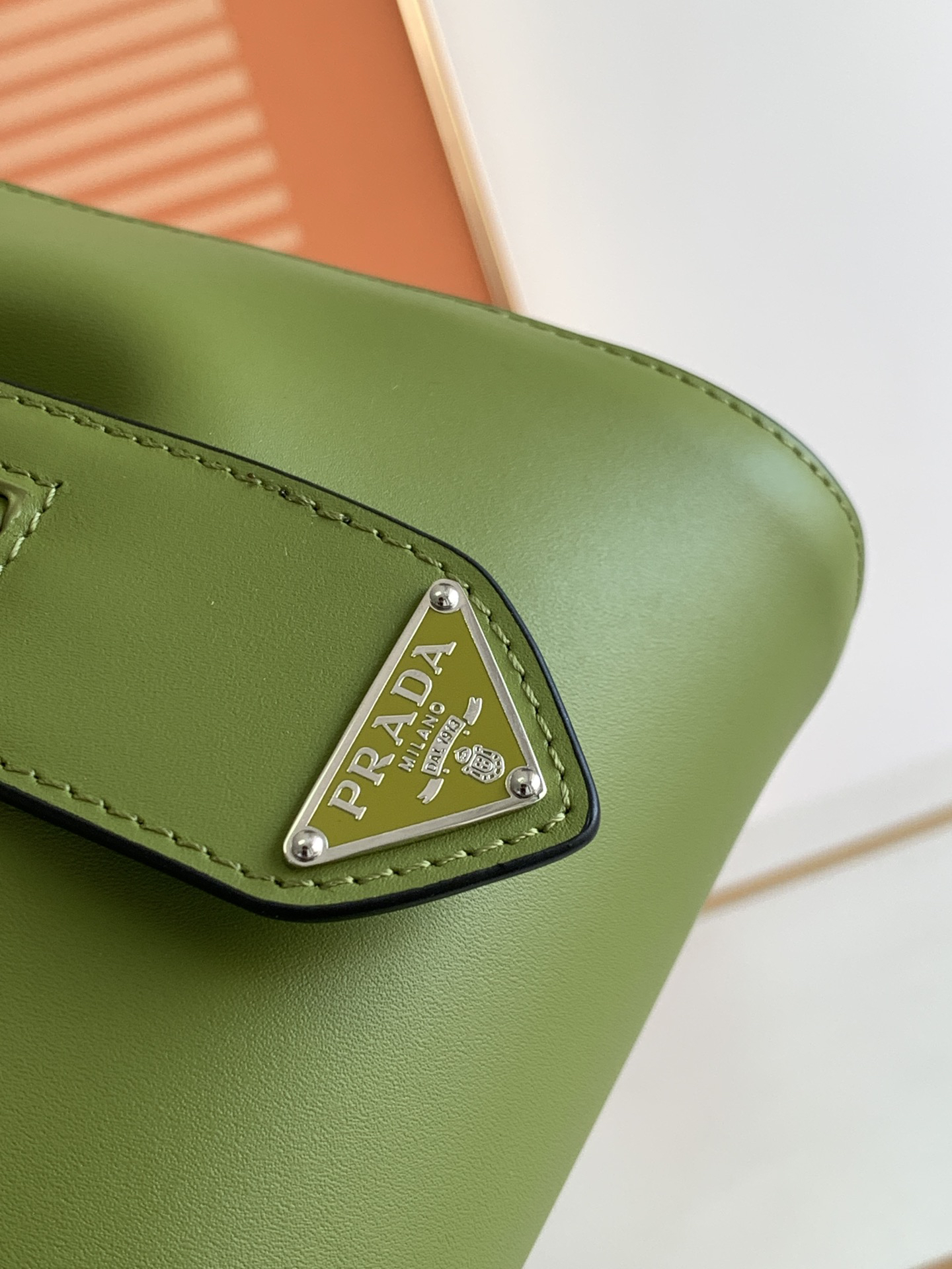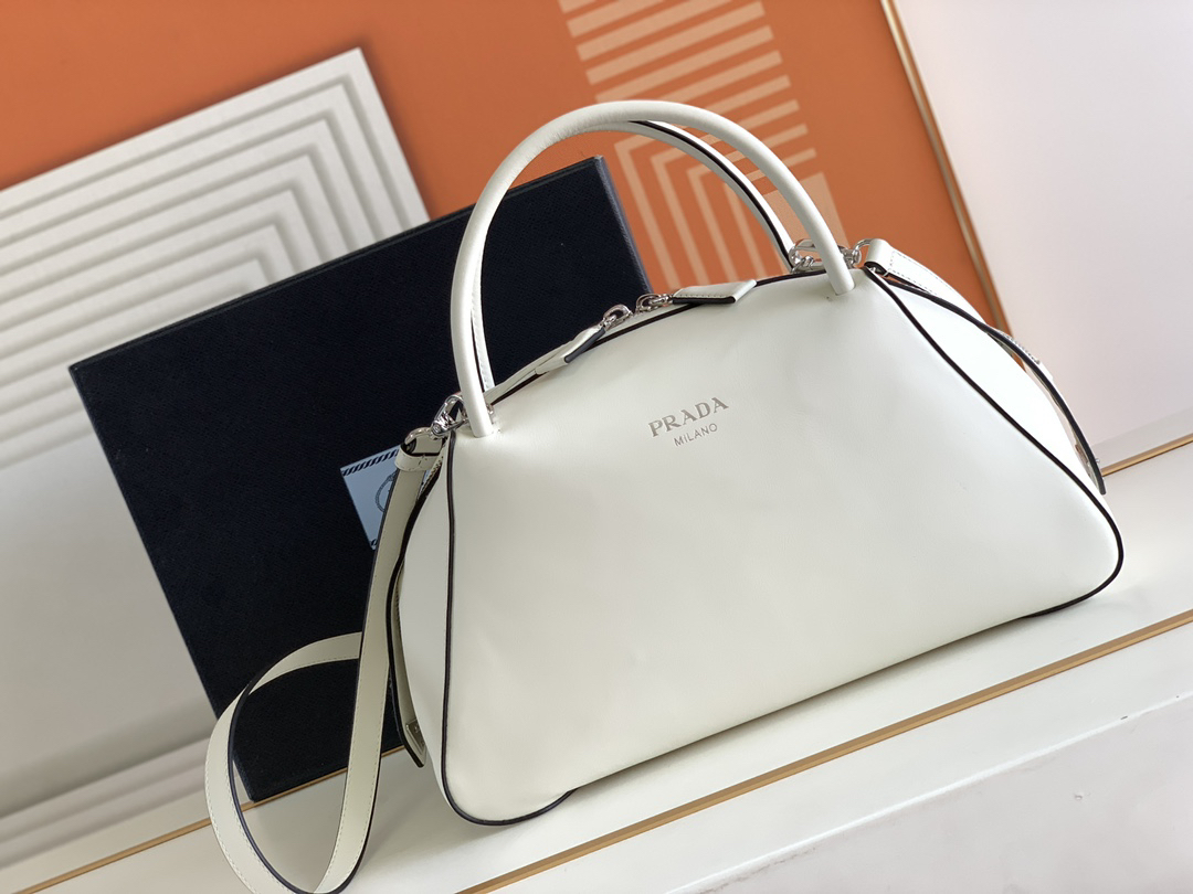プラダの2022年秋冬コレクションに登場した、洗練されたトップハンドルバッグ。光沢感のあるスムースレザーと柔らかいシープスキンインテリアの組み合わせが上質な雰囲気を演出。正面にはメタルトライアングルロゴと刻印ブランディングが施され、エレガントな印象に。31x16x13.5cmの大容量で実用的ながら、105cmの取り外し可能なショルダーストラップでハンドやショルダーとしても活用可能。