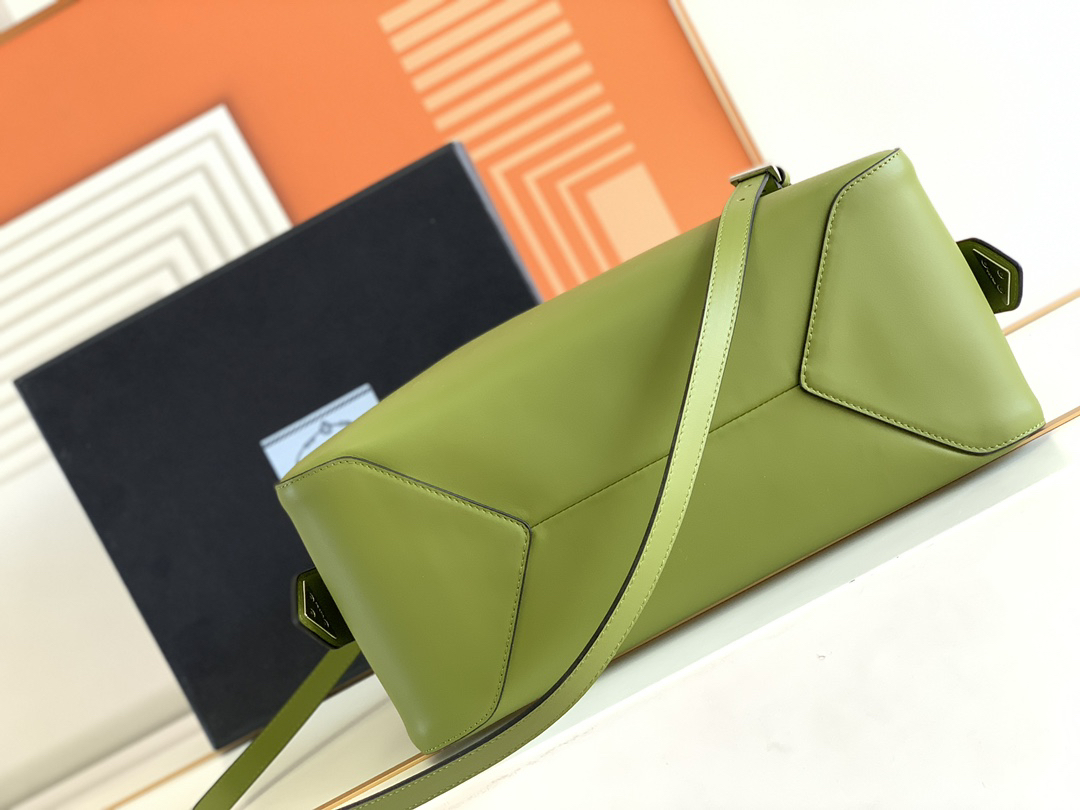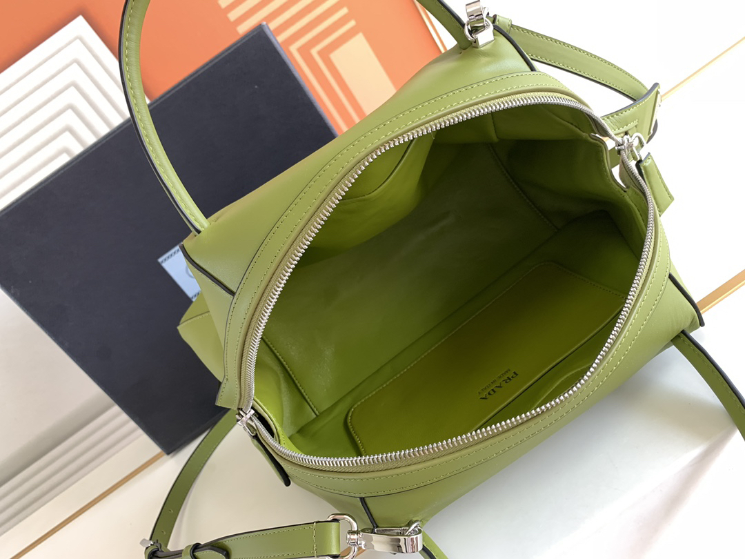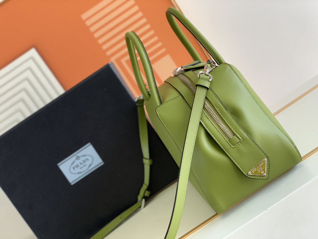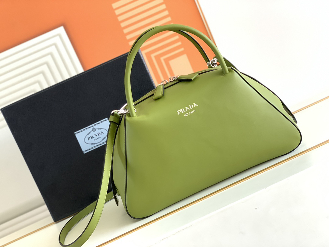 プラダの2022年秋冬コレクションに登場した、洗練されたトップハンドルバッグ。光沢感のあるスムースレザーと柔らかいシープスキンインテリアの組み合わせが上質な雰囲気を演出。正面にはメタルトライアングルロゴと刻印ブランディングが施され、エレガントな印象に。31x16x13.5cmの大容量で実用的ながら、105cmの取り外し可能なショルダーストラップでハンドやショルダーとしても活用可能。
