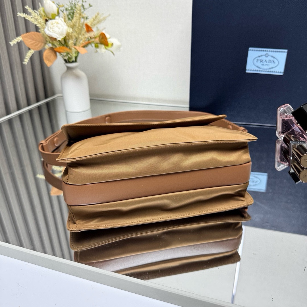 プラダが得意とするテクニカルナイロンとスムースレザーを組み合わせ。軽量化と質感のコントラストにより、従来のショルダーバッグの概念を刷新。 -