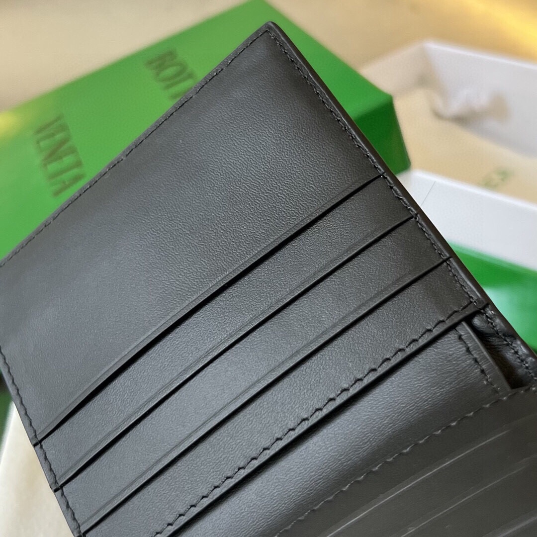 ボッテガ ヴェネタの象徴的なイントレチャート編みを施した厚さ1cmの超薄型ウォレット。10×9.5cmのコンコンパクトサイズに6カードスロット+紙幣ポケット+2機能ポケットを凝縮。イタリア産の黒色カルフスキンを0.2mm幅で精密に編み上げた軽量ボディは、ジャケットの胸ポケットにもすっと収まる洗練さです。