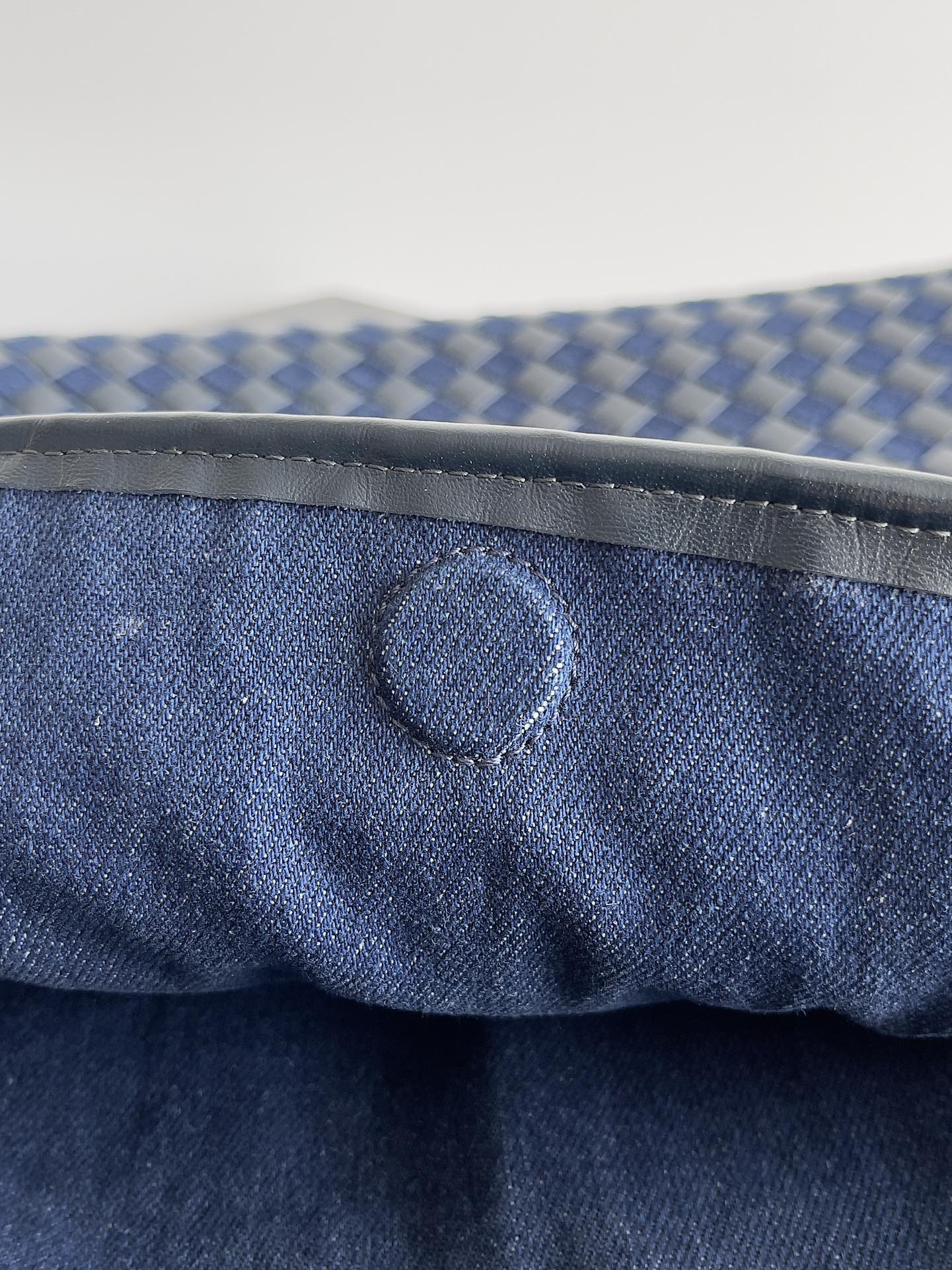 デニムのステッチングにボッテガ ヴェネタの伝統的な皮革処理技術を融合。シームレスなデザインがブランドの職人技を体現。 -
