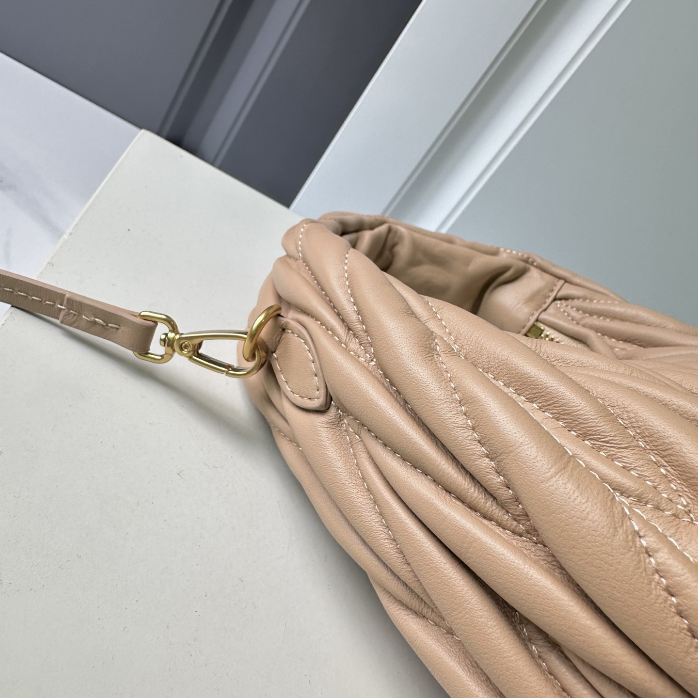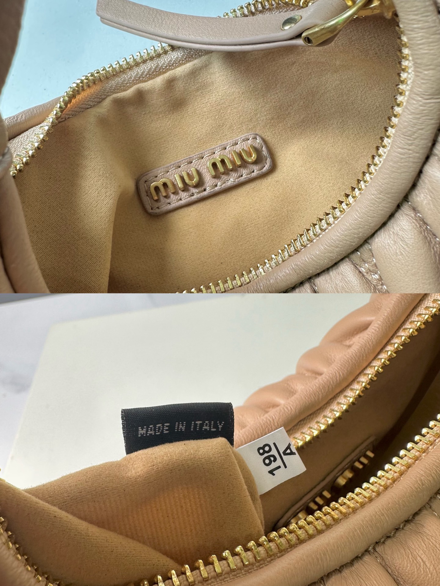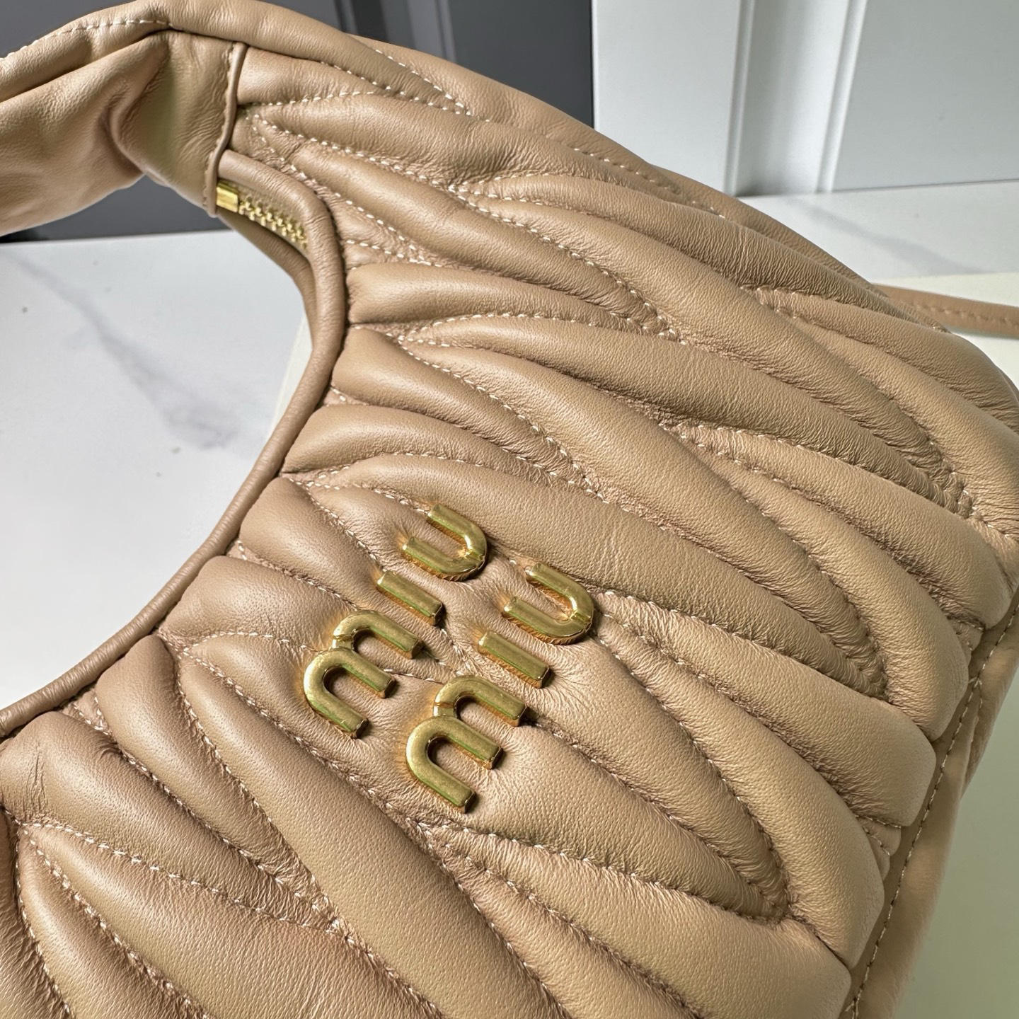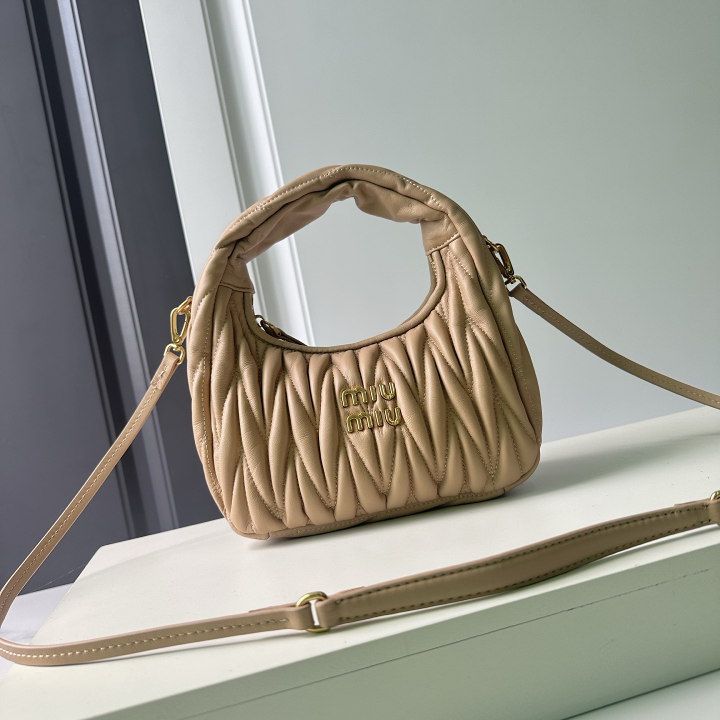 - ディテールの美学:ミニマルなMIU MIUロゴプレートとアンティーク調金具が、クラシックとモダンの調和を演出。