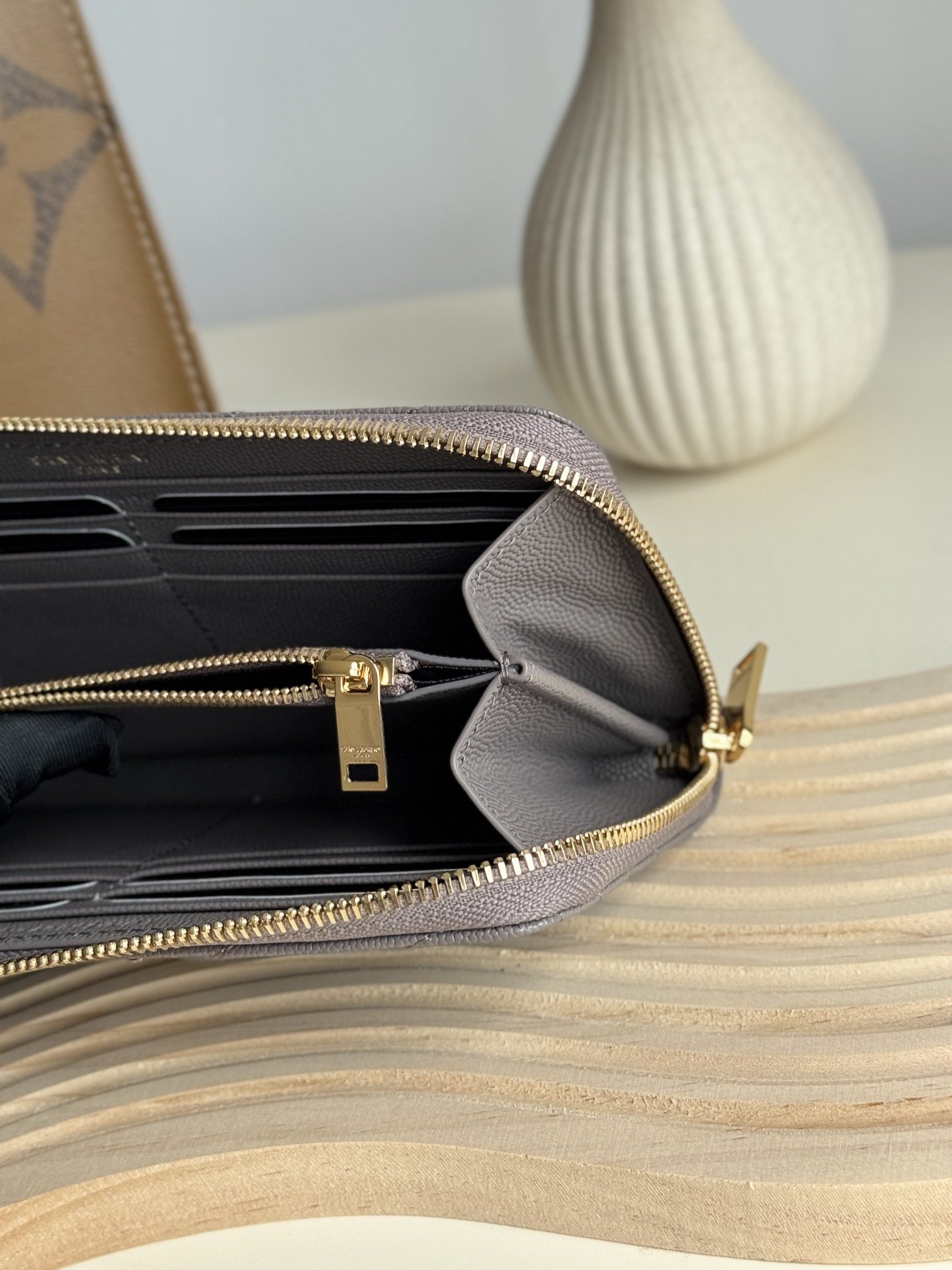 YSLの定番「ジップアラウンド ウォレット」は、機能性とスタイリッシュなデザインを兼ね備えたコンパクト財布。12のカードポケット、ファスター付きコインポケット、2つの紙幣用スペースに加え、レシート収納にも便利な2つのポケットを完備。高級キャビアレザーとメタリックな「YSL」ロゴが洗練された雰囲気を演出。スマホも収納可能な実用性で、日常使いに最適です。
