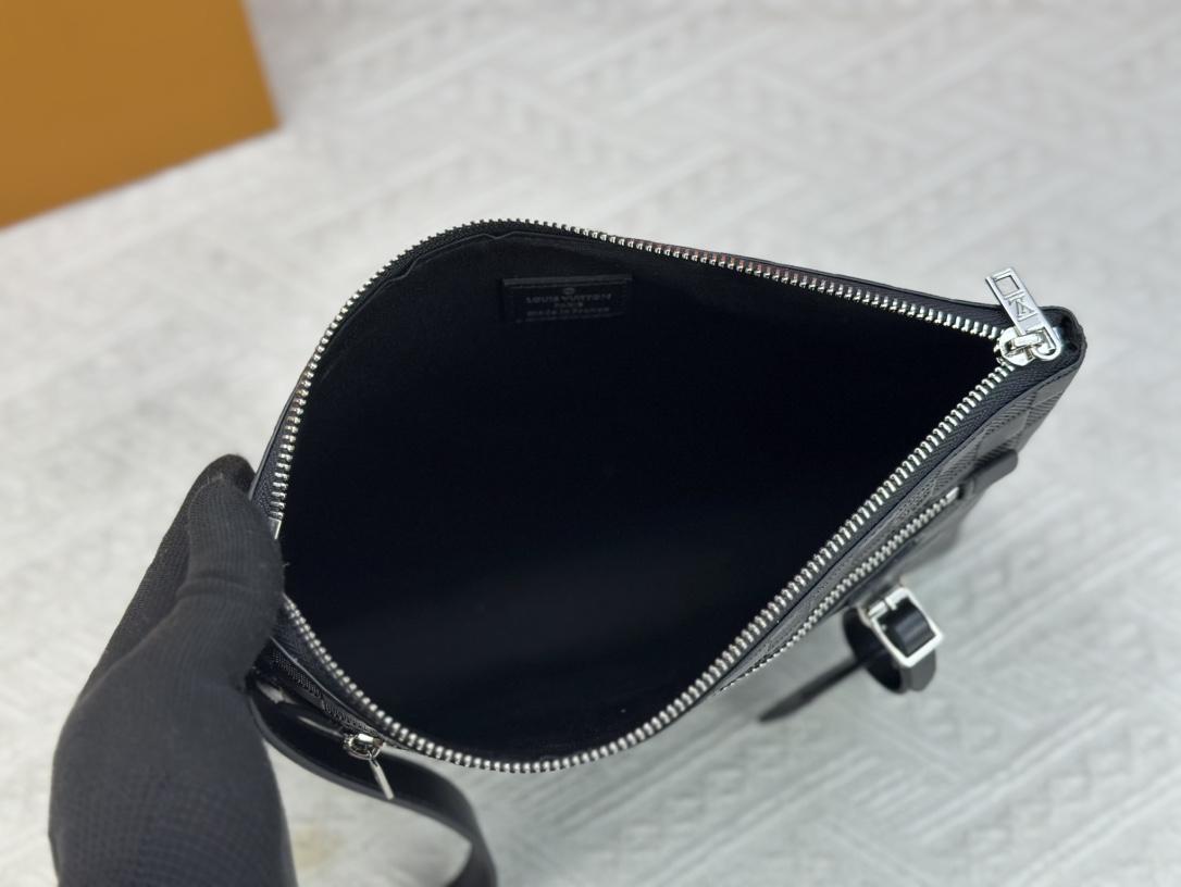 LV独自のダミエ・アンフィニ牛革を使用し、耐摩耗性に優れる。前面ファスナーポケット+メインコンパートメント+背面スリットポケット(*一部情報による)で小物を分類収納。 - ユニセックスなモダンシルエット