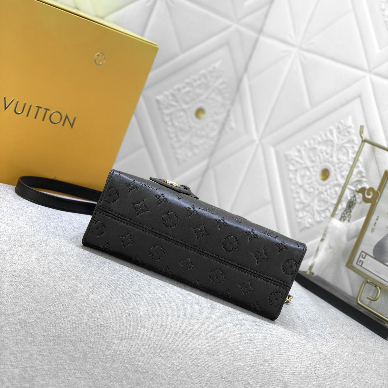 このオントゥゴー イースト ウエストバッグは牛革製で、レーザーカット彫刻とトロンプルイユエンボス加工を施したモノグラム模様が施された洗練された細身の長方形シルエットが特徴です。ライトゴールドメタルハードウェアと、ファッションコレクションからインスピレーションを得たモノグラムフラワーデティールの取り外し可能な荷札チャームが洗練されたスタイルを演出します。