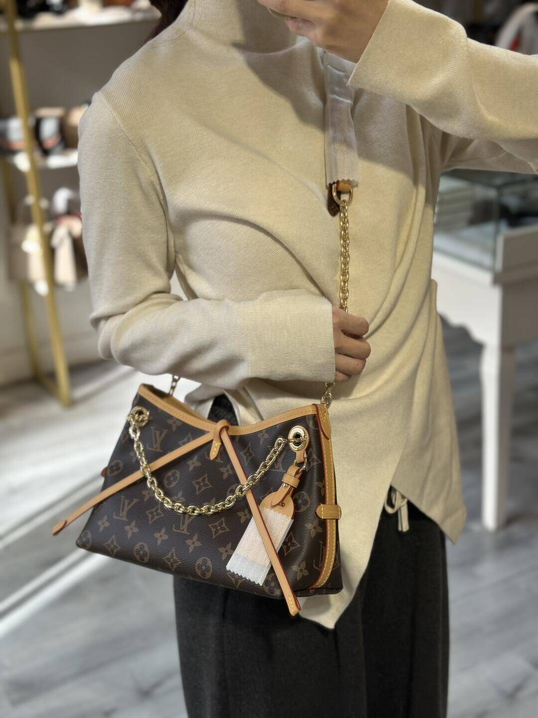 - :モノグラムコーティングキャンバスを使用し、牛革のフィニッシュを施しています。