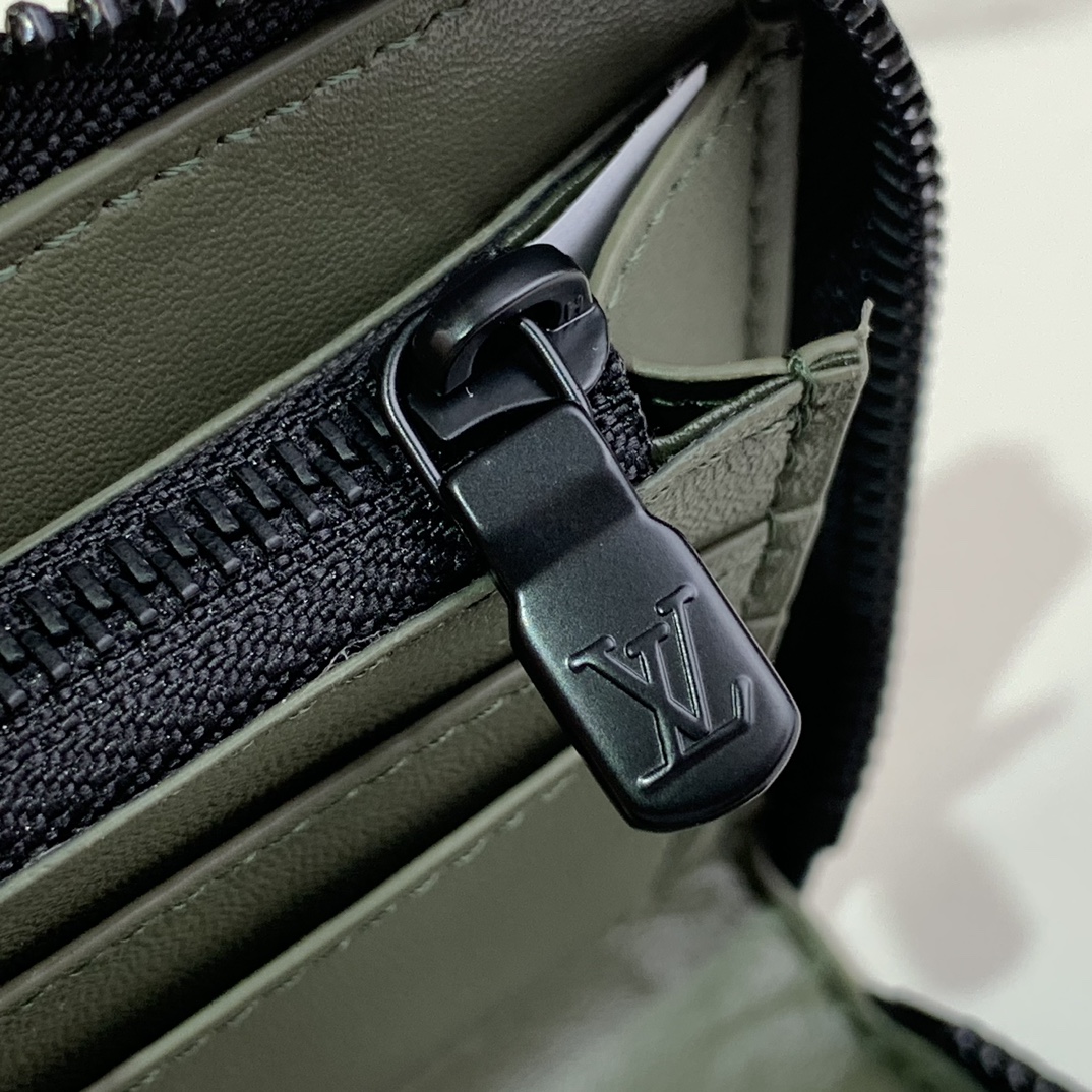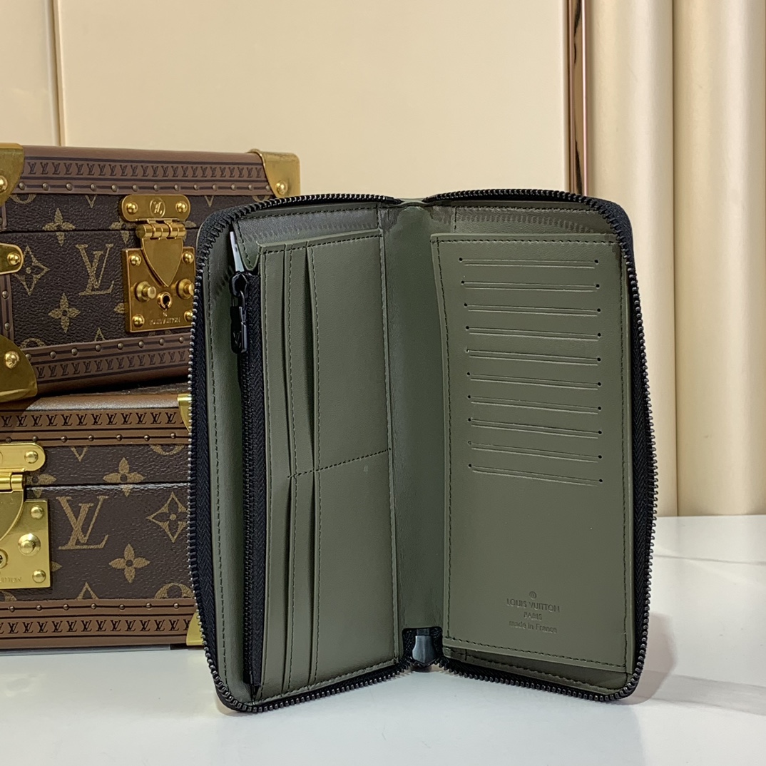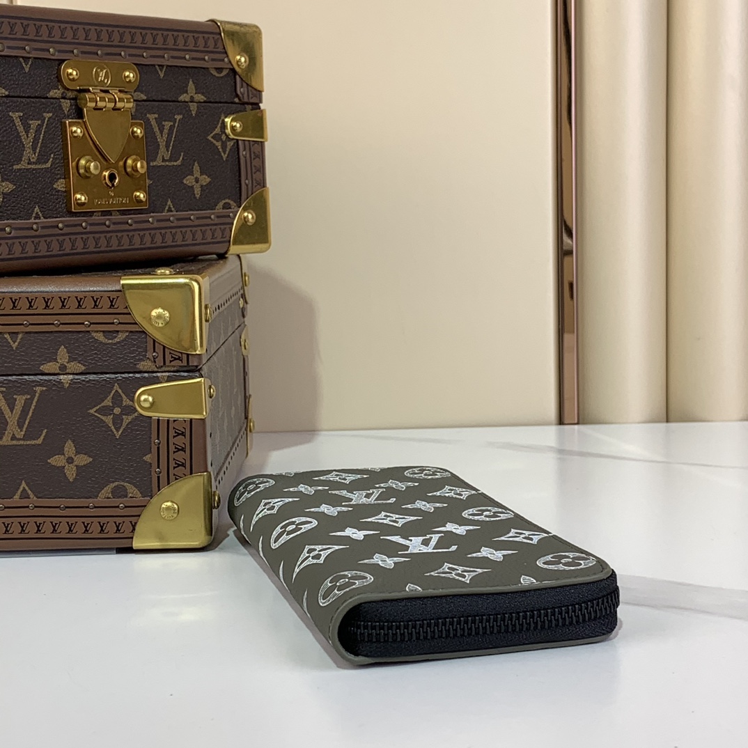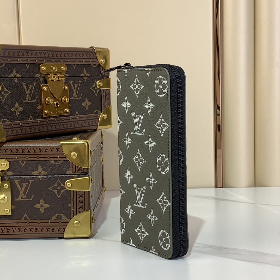 メゾンの定番「ジッピーウォレット・ヴェルティカル」をアレンジした「ジッピーウォレット・ホリゾンタル」。エンボス加工したモノグラム・シャドウ レザーに、同系色のカウハイドレザーのトリミングを施しました。ラウンドファスナー開閉式の実用的なデザインに、ファスナー付きポケットを中央に配したコンパートメントと、各サイドに6つずつ並べたカードスロット、紙幣や領収書用の2つのフラットポケットを備えています。