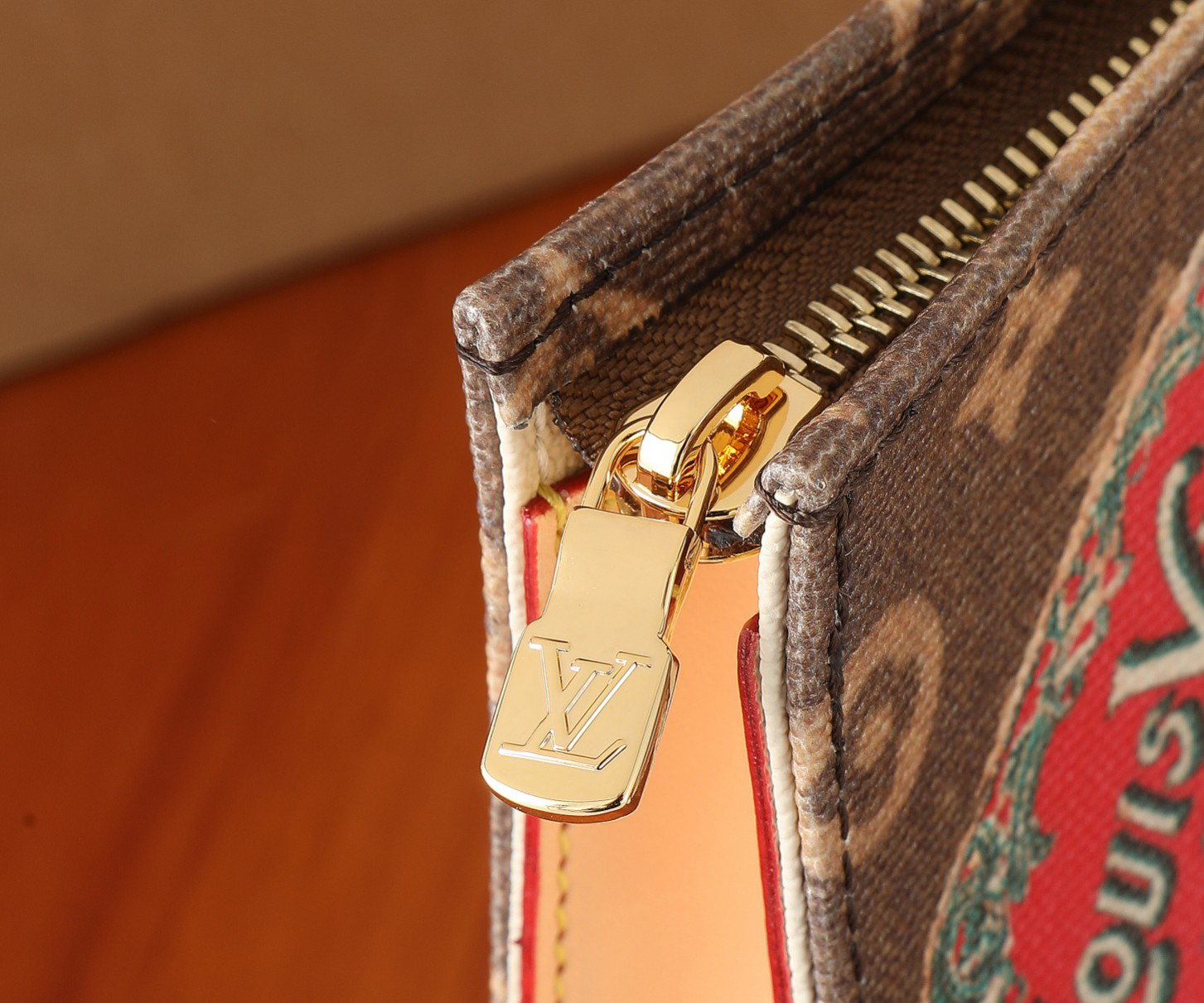 モノグラム コーティング キャンバス製のクラシックなトワレリー ポーチ。ヴィンテージ風ルイ・ヴィトン旅行ステッカーが華やかなアクセントに。内側のスリットポケットで小物を整理でき、コンパクトな手持ちサイズ(20 x 25 x 5.5 cm)で日常使いに最適。牛革トリムと洗えるライニングにより、機能性と耐久性を両立。