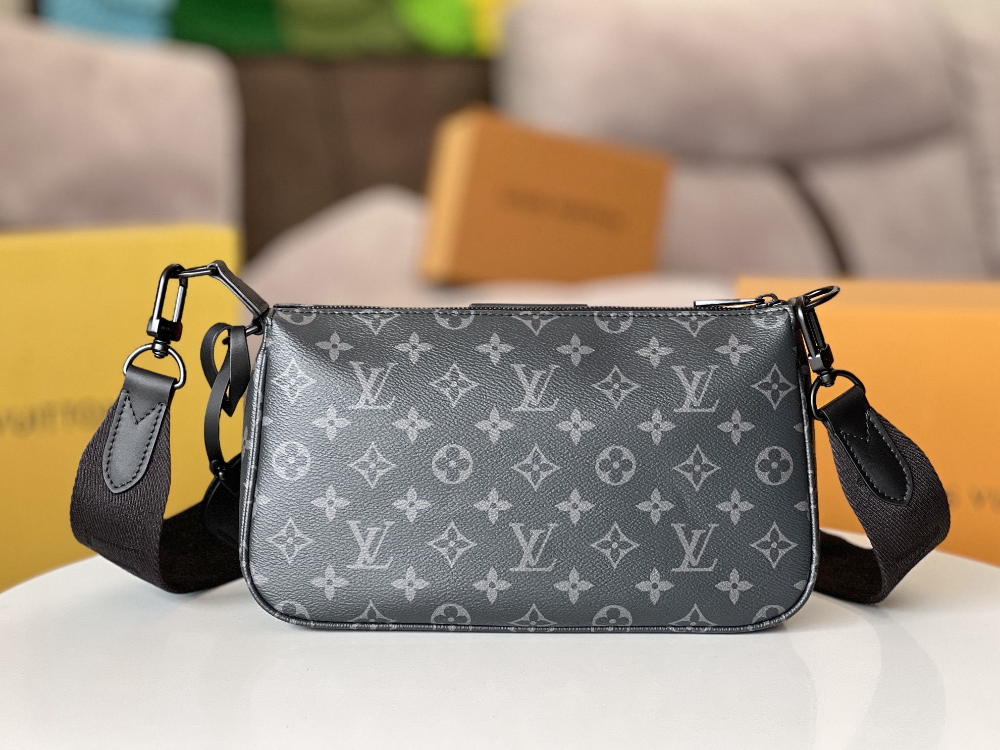 モノグラム・エクリプス キャンバスで仕上げた「ポシェット・アクセソワール XL」。収納力に優れたファスナー開閉式のメインコンパートメントと中身を整理しやすい内ポケットを備えています。ネームタグや取外し可能なテキスタイルストラップ、ブラックのメタルパーツなど、1990年代のメゾンを象徴するディテールをマスキュリンな雰囲気で再解釈しました。ショルダーバッグやクロスボディバッグとしても楽しめる調節可能なストラップ付き。