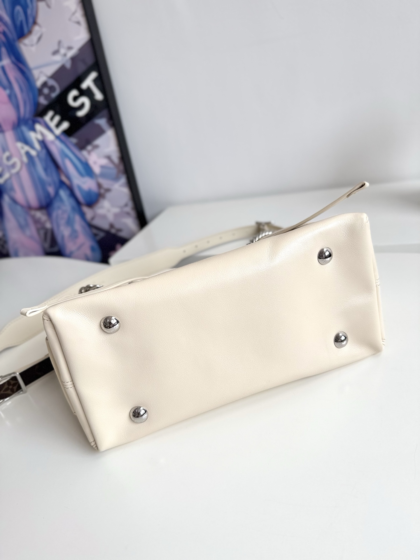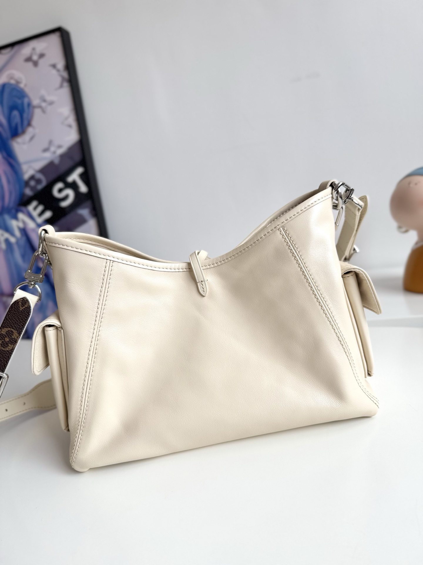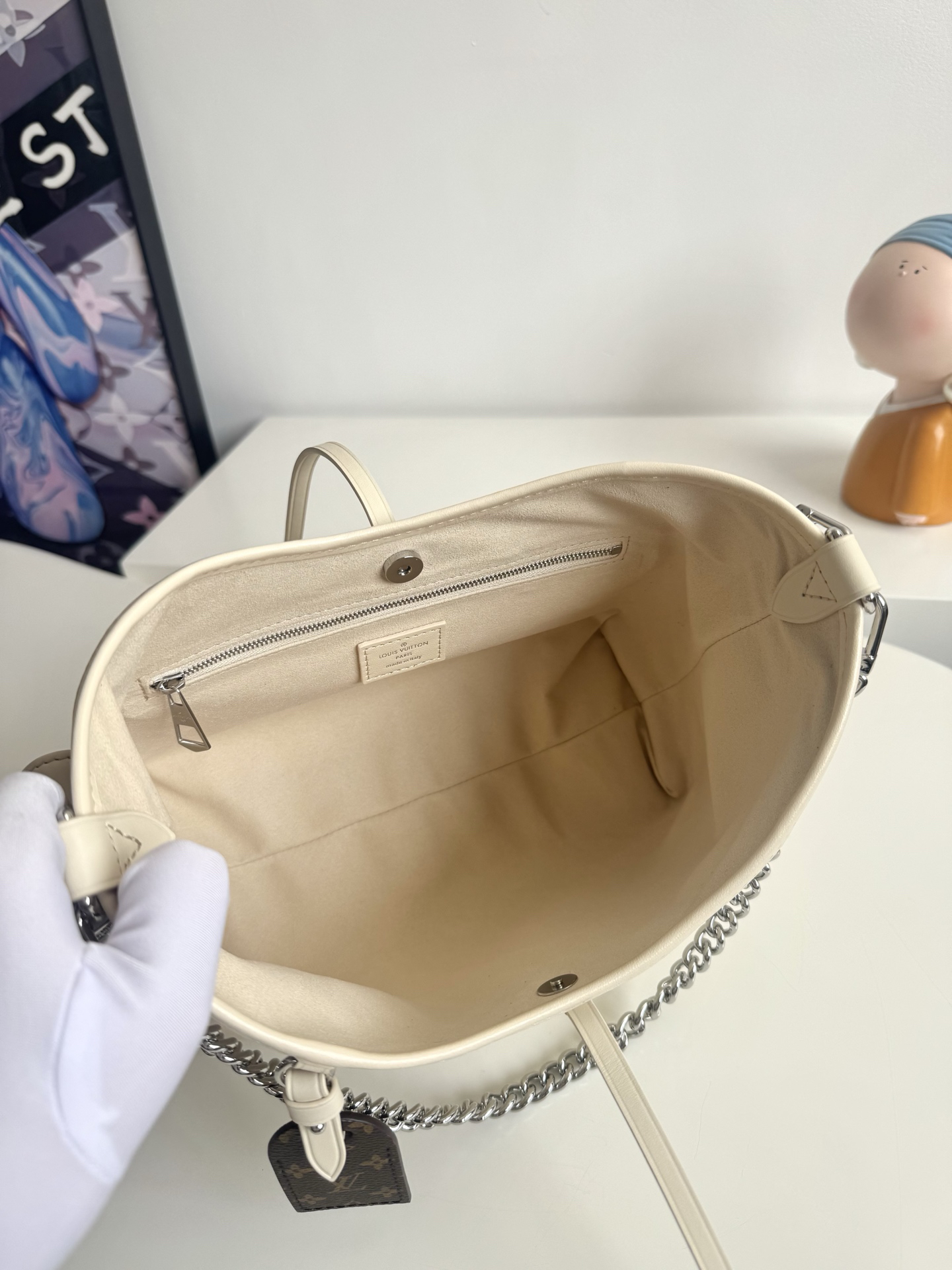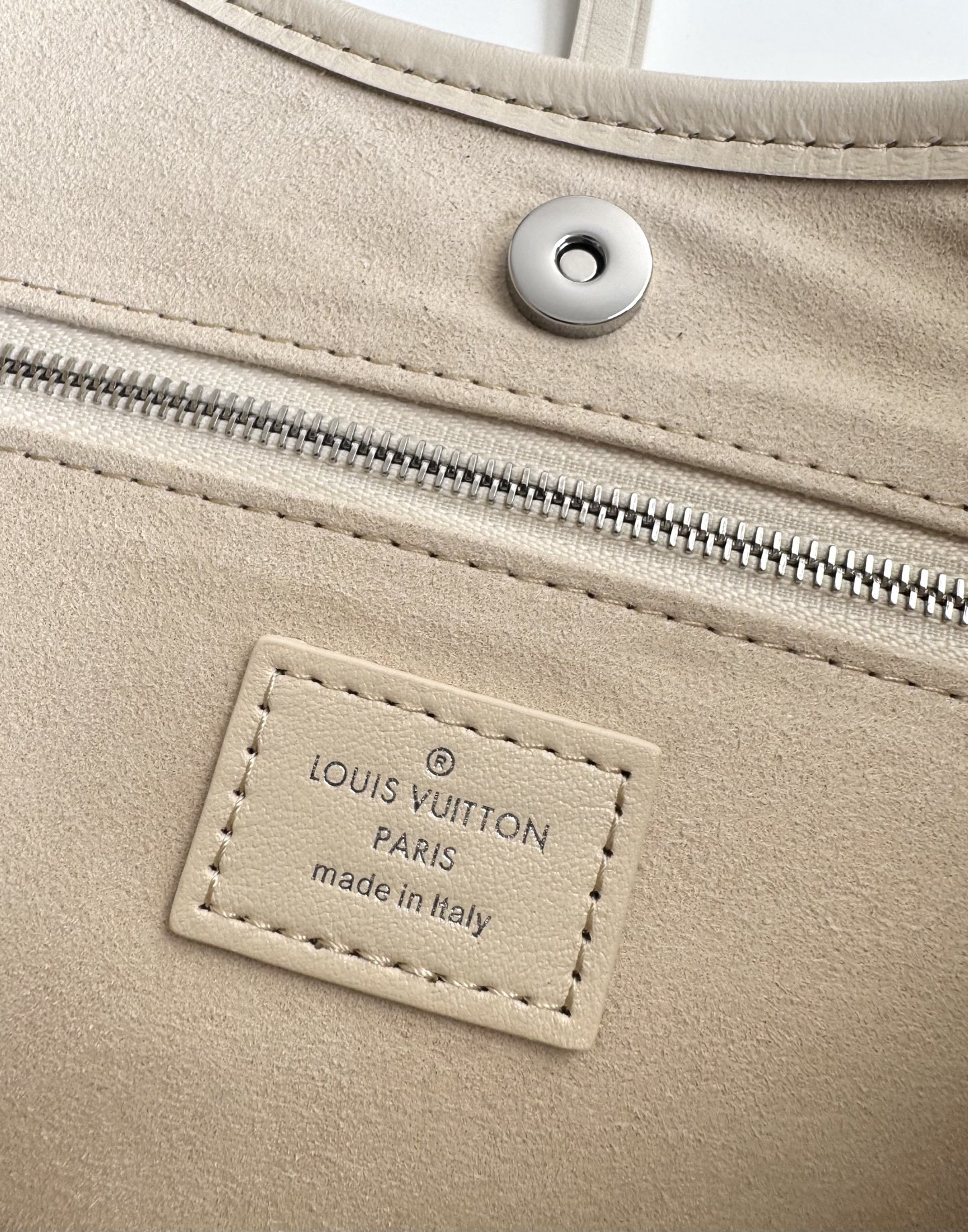 LOUIS VUITTONの「CarryAll Cargo Vibe」は、2024年秋冬コレクションで登場した柔らかな羊皮革製のコンパクトバッグ。サイズは23x15x33.5cmで、6.7インチスマートフォンや長財布などの日常小物を収納可能。モノグラムの取り外し可能なネームタグや金属製ハードウェアが洗練されたディテールを演出。カーフレザーのしなやかな質感とグリ・トリアノンカラーのモダンな配色が特徴。