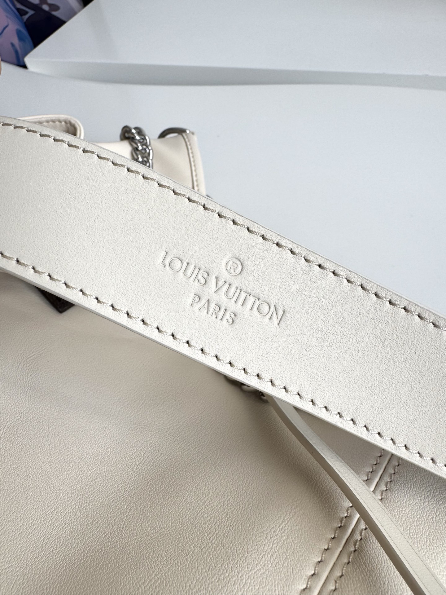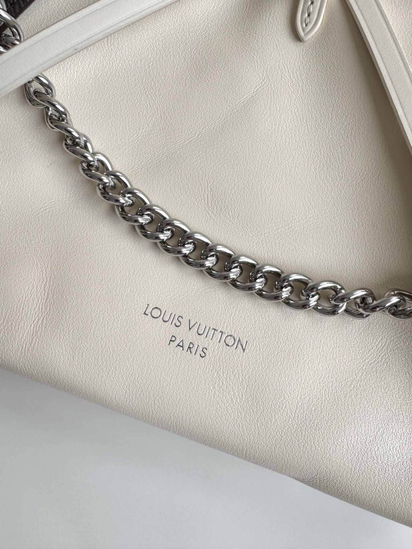 アイコニックなディテール: LVロゴの金属ハードウェアとレザー結び紐がブランドの匠の技術を表現。