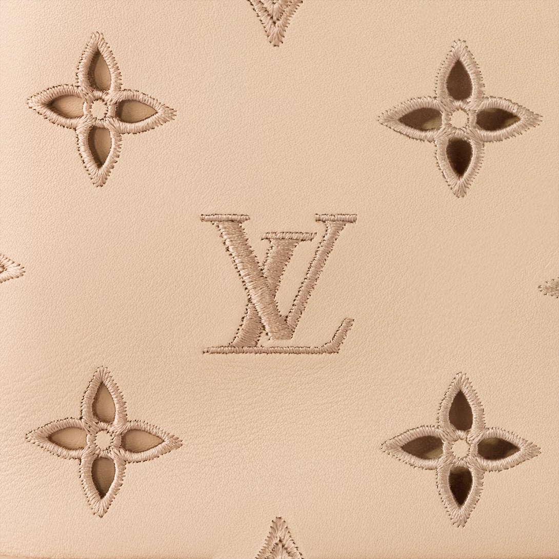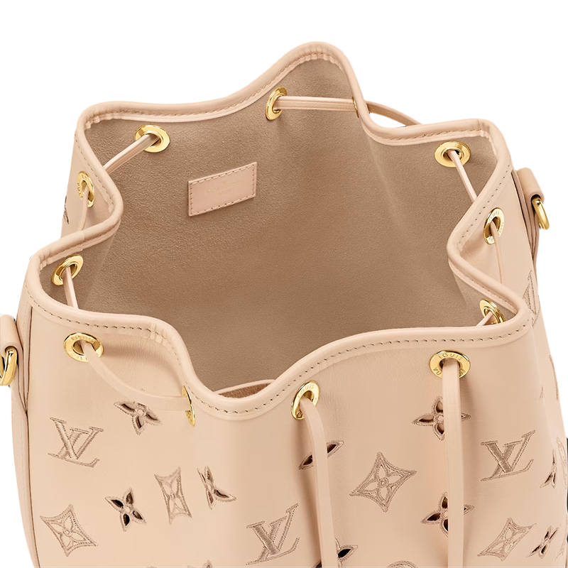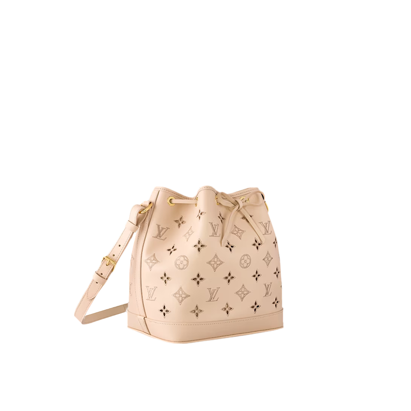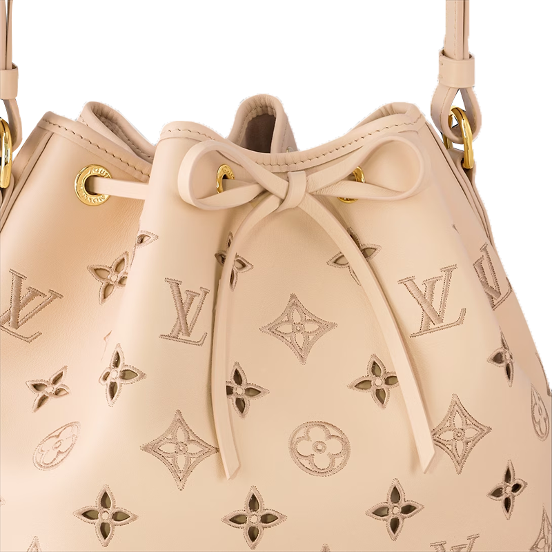 LV ブロデリーアングレーズのテーマで表現した、メゾンが誇るクラフツマンシップが光るプチノエ。柔らかいカーフレザーにアイコニックなモノグラムパターンをパーフォレーションで施し、アングレーズ刺繍を想わせるブルドンステッチで繊細な刺繍をあしらいました。エクスクルーシブな夏らしい色合いのアイテムは、調節可能なストラップでショルダーバッグとしてもクロスボディバッグとしてもお楽しみいただけます。